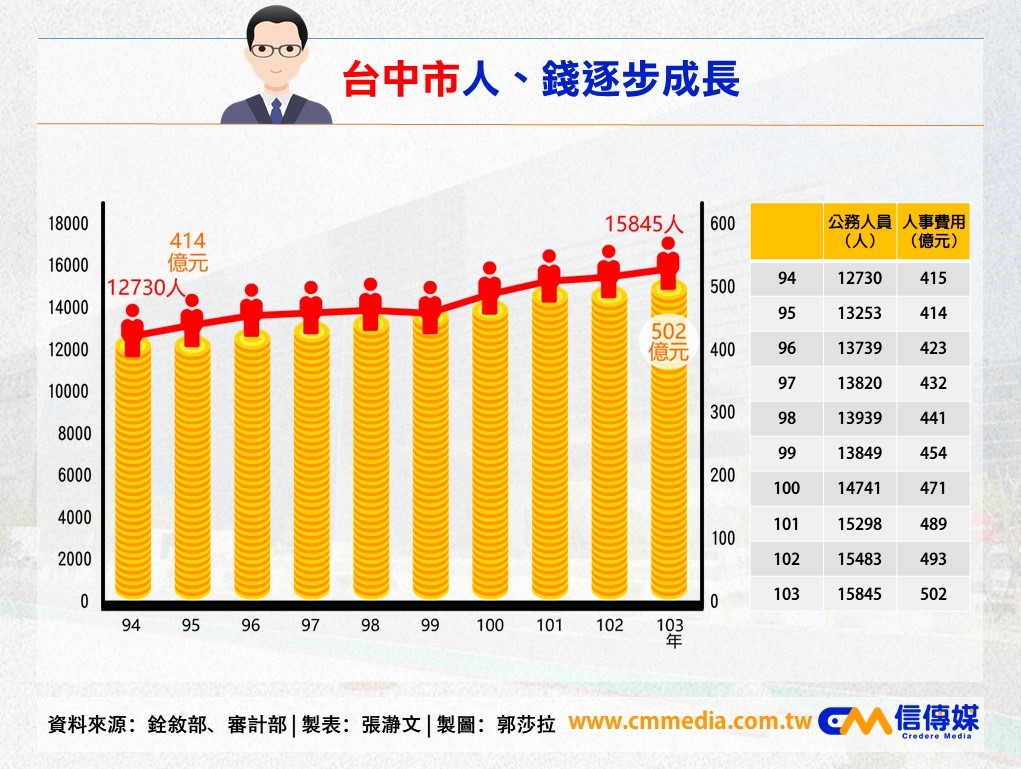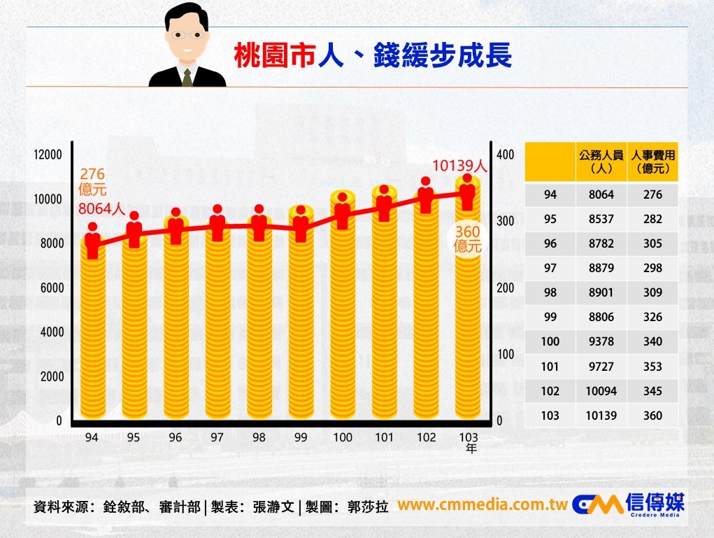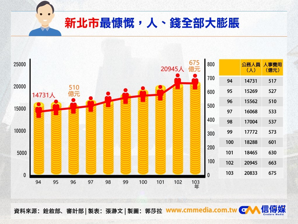 尤其最誇張的是新北市,新北市從96年成為準直轄市以來,人事費用一路走高,若從103年,審計部公布的新北市人事費用達675億元來看,近8年來新北市公務員增加5331人,人事費用增加165億元。