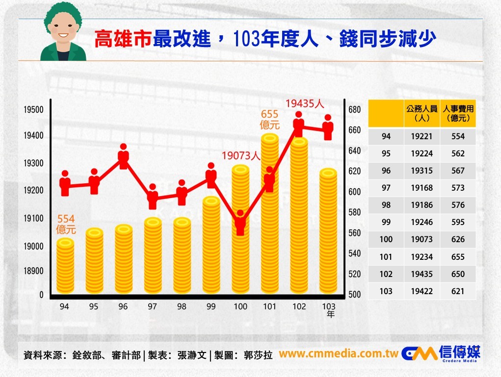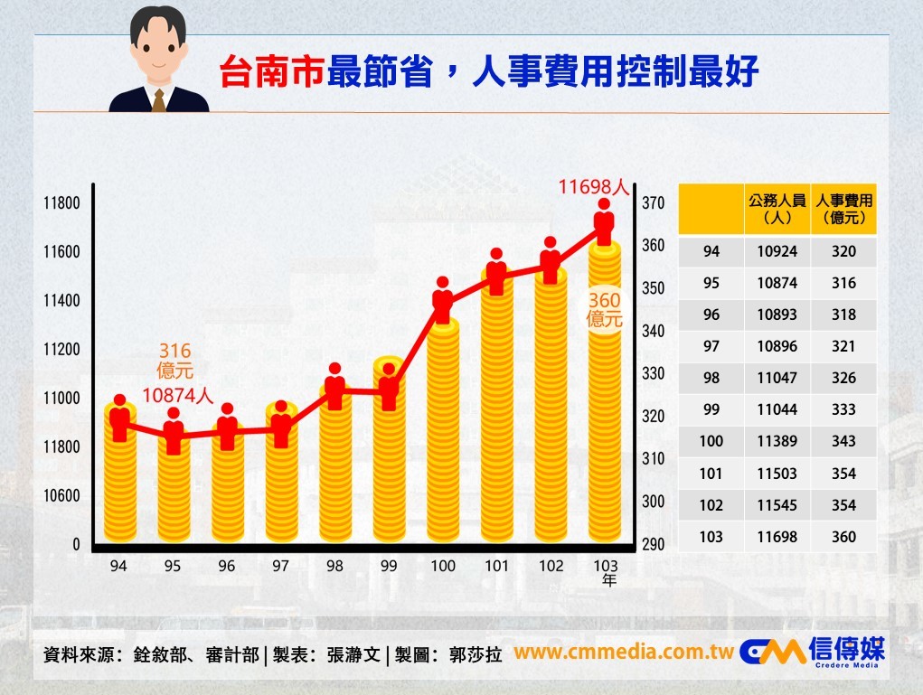 至於原本財政狀況就不好的台南及高雄,人員以及人事費用成長幅度都很小,其中賴清德執政的台南市,從99年升格為直轄市開始,公務員人數至今僅增加654人、增幅5.92%。人事費用從99年的333億元,增加至103年的360億元,5年間增加27億元,增加幅度8.1%。