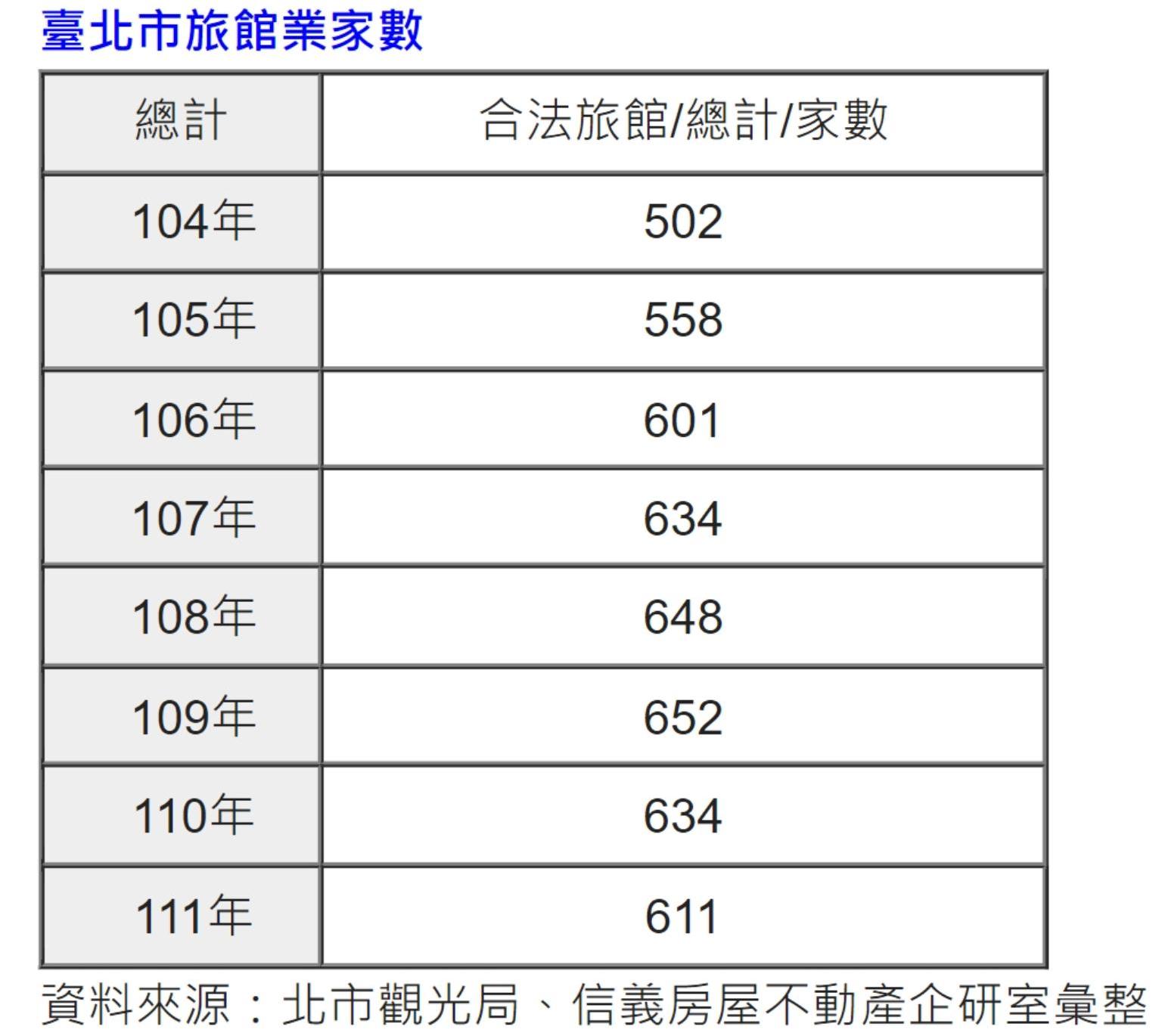 根據台北市旅館業家數統計,近年北市合法旅館家數高峰在疫情時的652家,但受疫情衝擊與政府積極推動危老改建,台北市2022年合法旅館家數剩下611家,減少數量達41家,其中有超過一半都已經核准危老改建,顯示北市老舊旅館正出現一波改建潮。