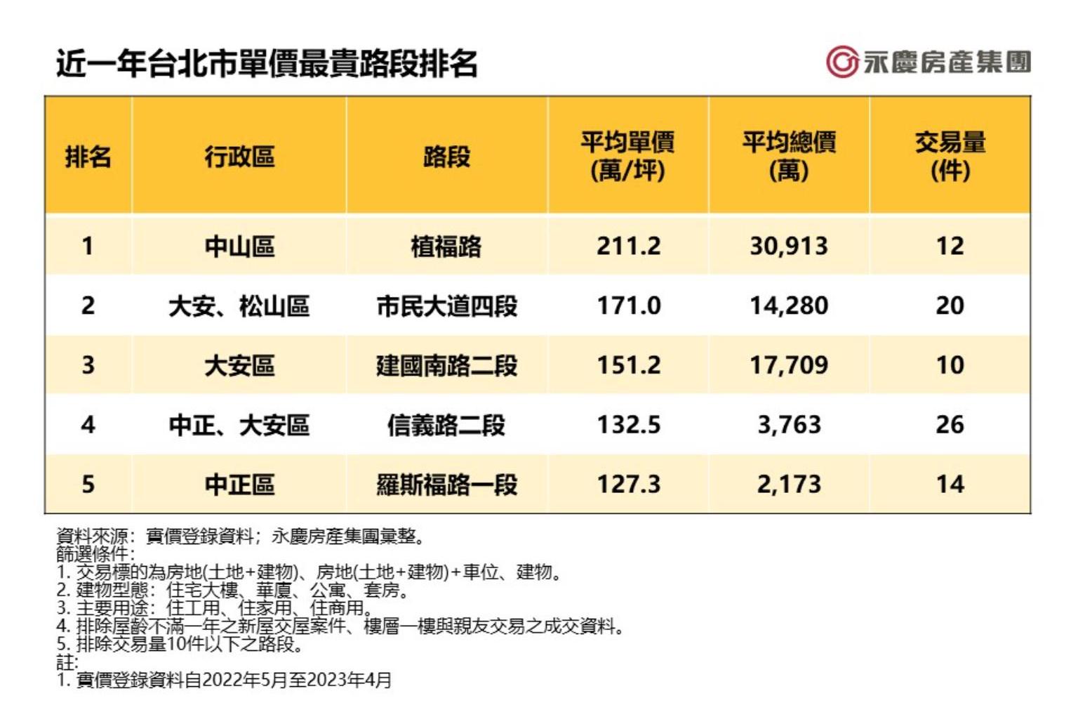 台北市單價最貴路段為中山區植福路,近一年住宅平均單價約每坪211.2萬元,永慶房屋研展中心副理陳金萍表示,植福路位於大直重劃區內,周邊豪宅、高級飯店、大型商辦林立,生活及商業機能發達。除了交通便捷,加上高比例的公園綠地,離塵不離城的優良居住環境備受高端消費族群的青睞。觀察植福路的12件交易中,皆來自「西華富邦」社區,是大直的指標豪宅之一,平均總價高達3億元以上,豪宅的加持也推升了此路段的房價。