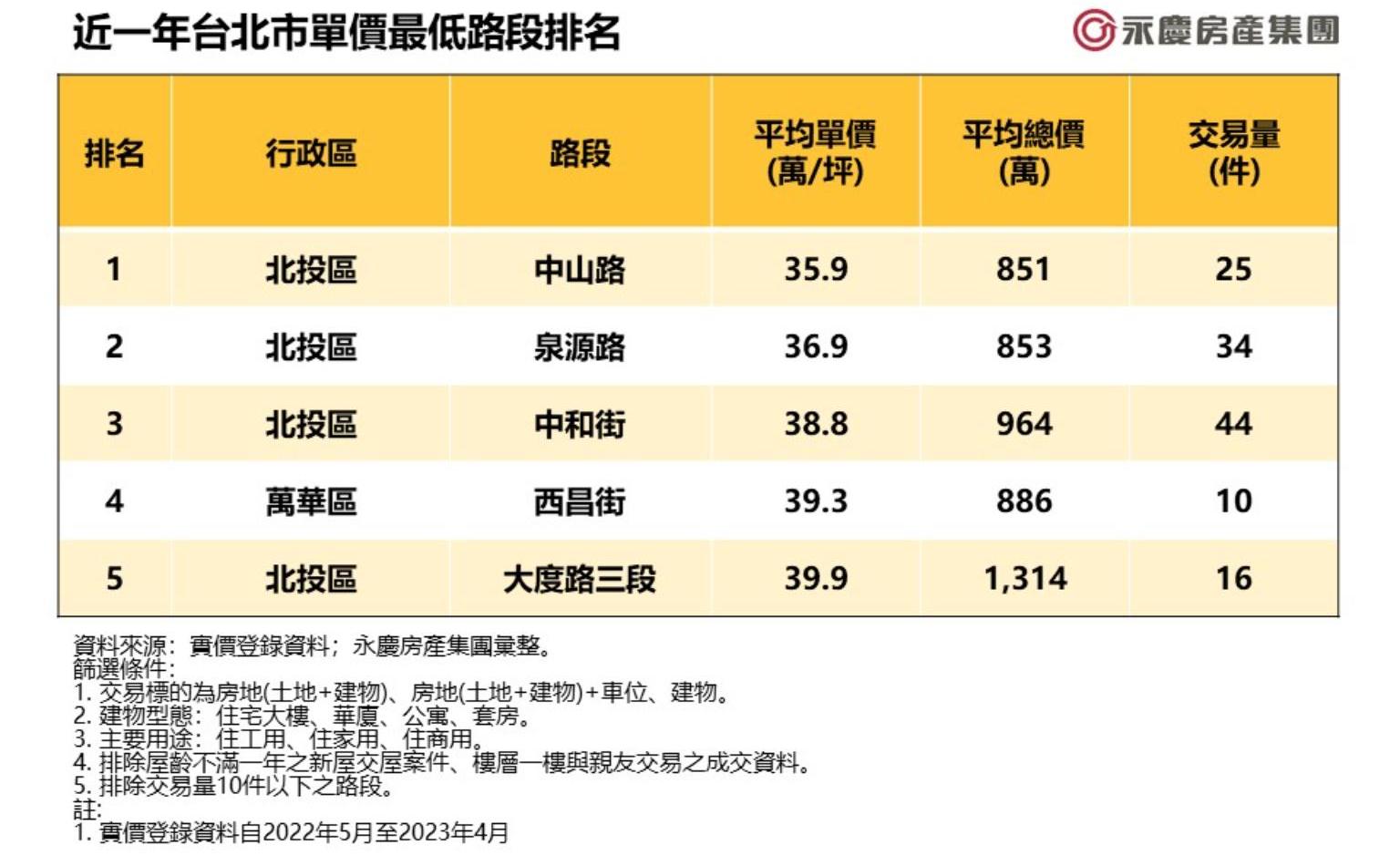 北市房價最親民的路段前三名皆位在北投區,分別為中山路、泉源路和中和街,平均單價均不到39萬元。陳金萍說明,中山路及泉源路鄰近新北投捷運站,搭乘捷運約半小時左右能抵達市中心,兩路段皆是從捷運站向東分支的道路,走路大約莫10至15分鐘可到達;其中,中山路的住宅區位於末端,與生活機能完備的捷運站周邊稍有一小段距離,因此價格上相對便宜。兩路段遠離城市喧鬧,環境清幽,平均總價約1000萬元就能輕鬆入手,適合偏好親近大自然的購屋族群。