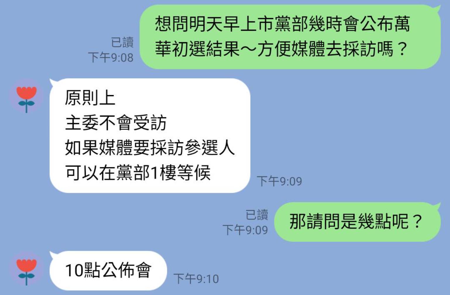 昨晚《信傳媒》記者向台北市黨部重要幹部詢問14日幾時會公布結果,對方表示,上午10時會舉行公布會,媒體可以到場採訪參選人,但市黨部主委黃呂錦茹原則上不受訪。