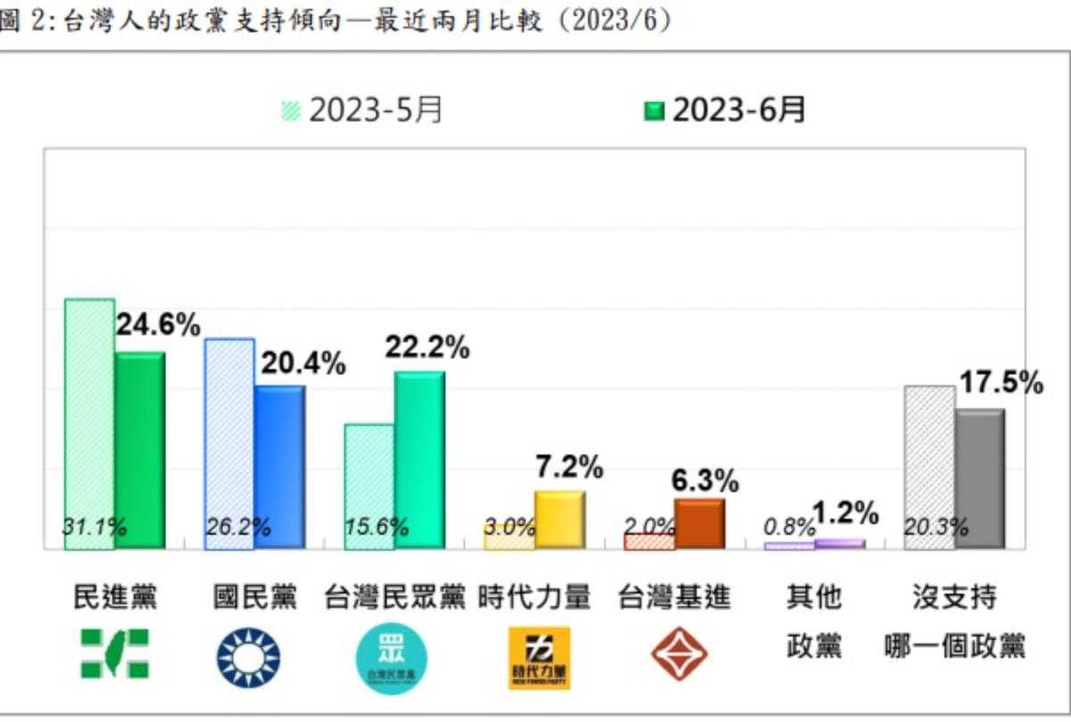 同時與5月相比,民進黨下滑6.5%,國民黨下滑5.8%;其他政黨反向上揚,民眾黨大進補6.6%。
