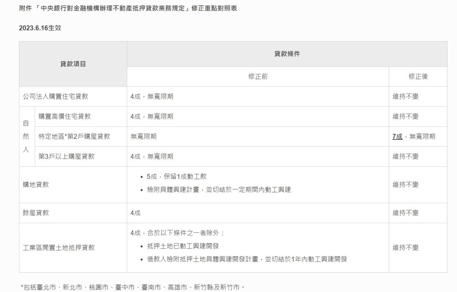 為續強化管理銀行信用資源,降低相關授信風險,本次央行修正「中央銀行對金融機構辦理不動產抵押貸款業務規定」,新增規範自然人特定地區第2戶購屋貸款最高成數上限為7成,自本年6月16日起實施。