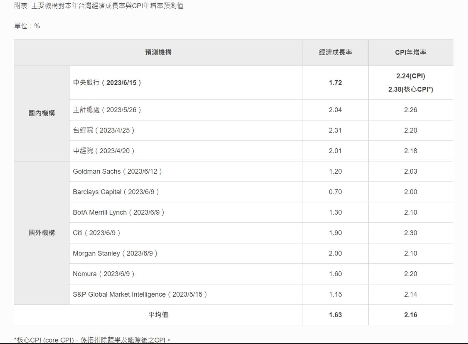 央行今天除了宣布停止升息外,並對下半年景氣開了第一槍,率先將今年經濟成長率預測值從3月的2.21%,調降至1.72%,正式宣告今年保二落空,同時央行也將今年通膨率預估值上調至2.24%,核心CPI年增率為2.38%。