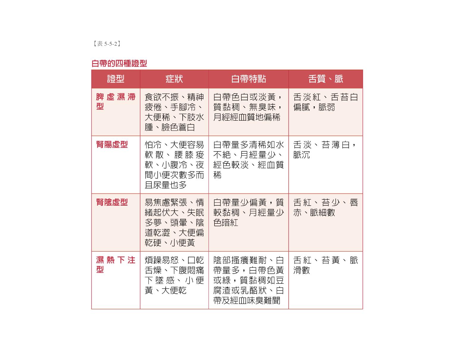 白帶在中醫可以分為以下的證型:其中脾虛濕滯型跟腎陽虛型比較像生理性白帶;腎陰虛型白帶類似更年期或雌激素不足時萎縮性陰道炎;濕熱下注型白帶則是有感染發炎的情形。