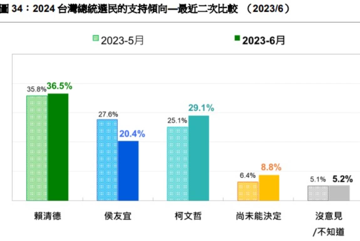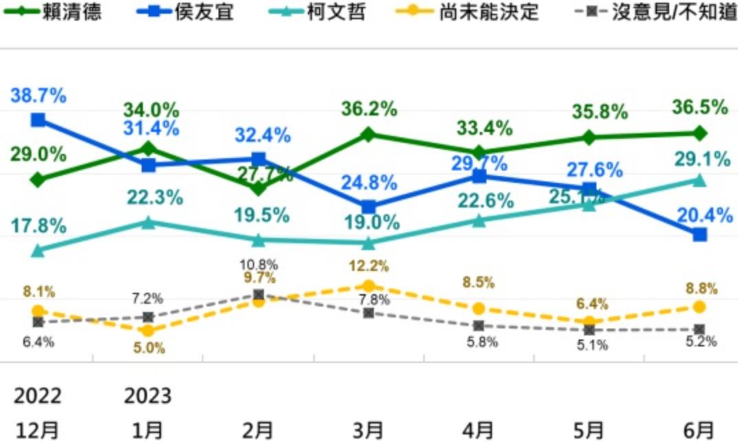台灣民意基金會今日公布6月民調顯示,民進黨主席賴清的支持度達3成7居冠,台灣民眾黨主席柯文哲衝到2成9為第二名,新北市長侯友宜大跌至2成墊底。