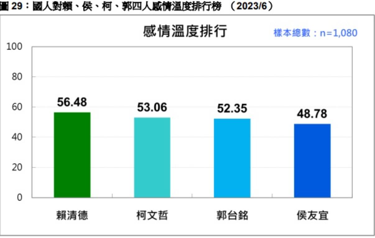 此外,有關台灣人對主要總統候選人的感情溫度,調查果發現:賴清德56.48度排行第一,柯文哲53.06排行第二,郭台銘52.35排行第三,侯友宜48.78排行第四,敬陪末座。