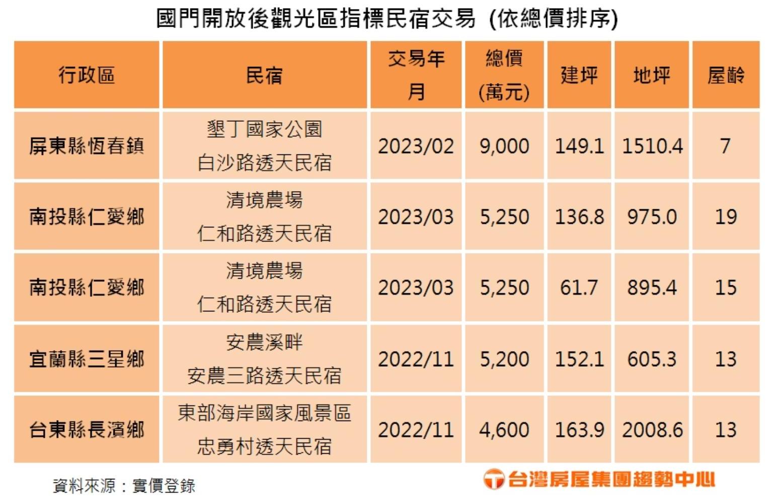 去年10月國門解禁後,旅宿業迎來春燕,國內的觀光大縣,也頻頻出現總價逾4,000萬元的「豪宅級民宿交易」!根據實價登錄揭露,國境之南的屏東恆春白沙路,今年2月出現一筆總價9,000萬元、屋齡7年的透天厝交易,經查該透天厝過去曾為「白灣villa」民宿,佔地超過1,500坪,暫居屏東今年總價最高的旅宿相關交易!