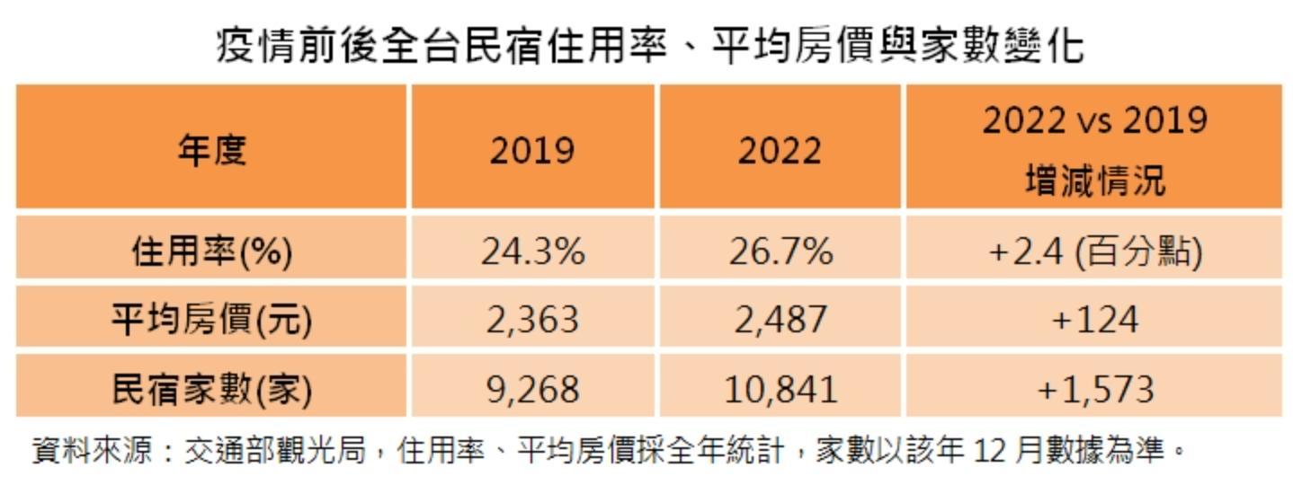 台灣房屋集團趨勢中心資深經理陳定中表示,後疫情時代觀光業回溫,再掀民宿發展熱潮,據交通部觀光局統計,去年全台合法民宿家數達10,841家,比疫情前的2019年增長逾1,500家,且平均房價2,487元,也比疫情前漲逾5%,客房住用率26.7%,更創下統計以來年度新高,隨著民宿蓬勃發展,相關不動產交易也跟著轉熱。