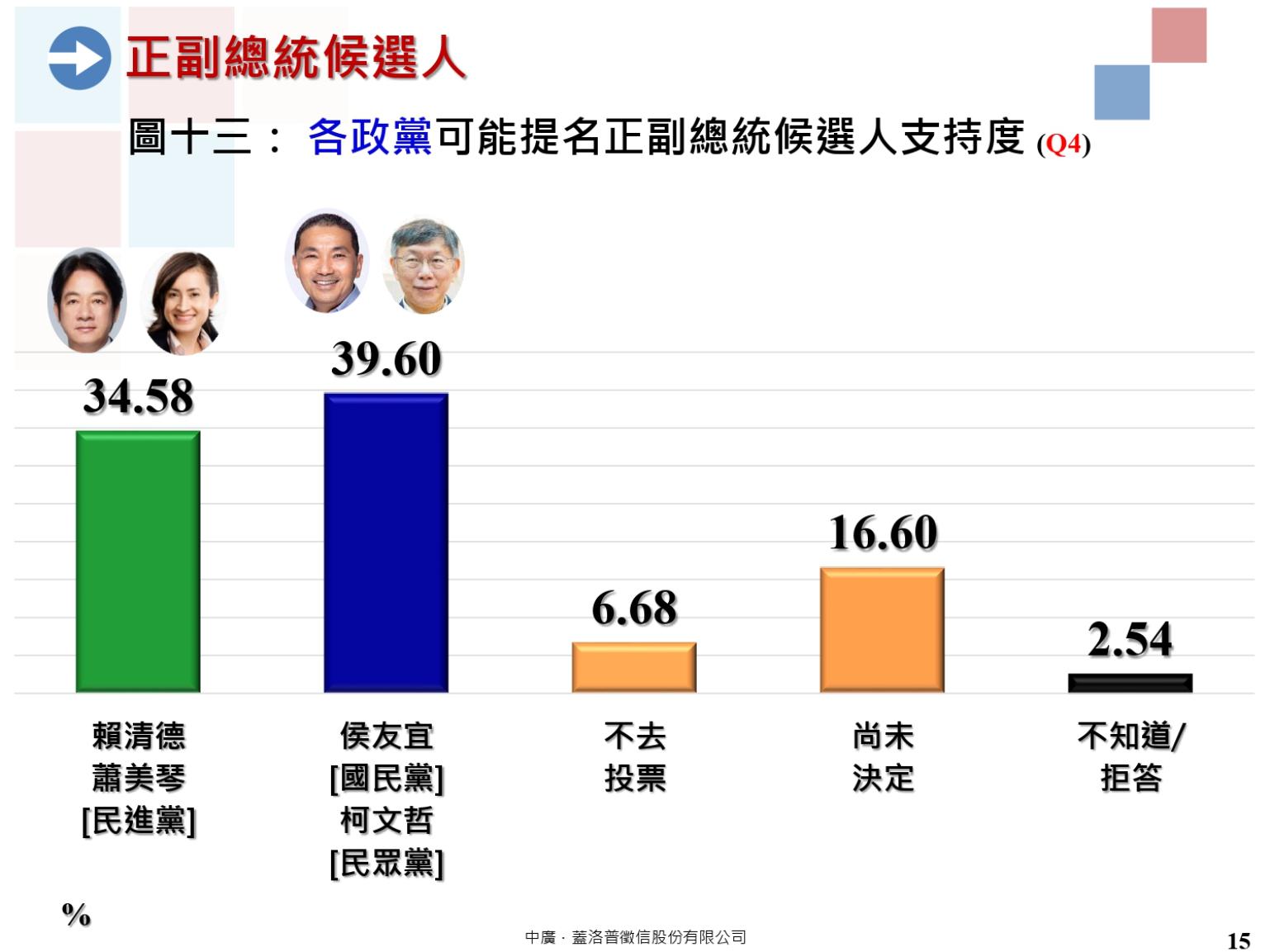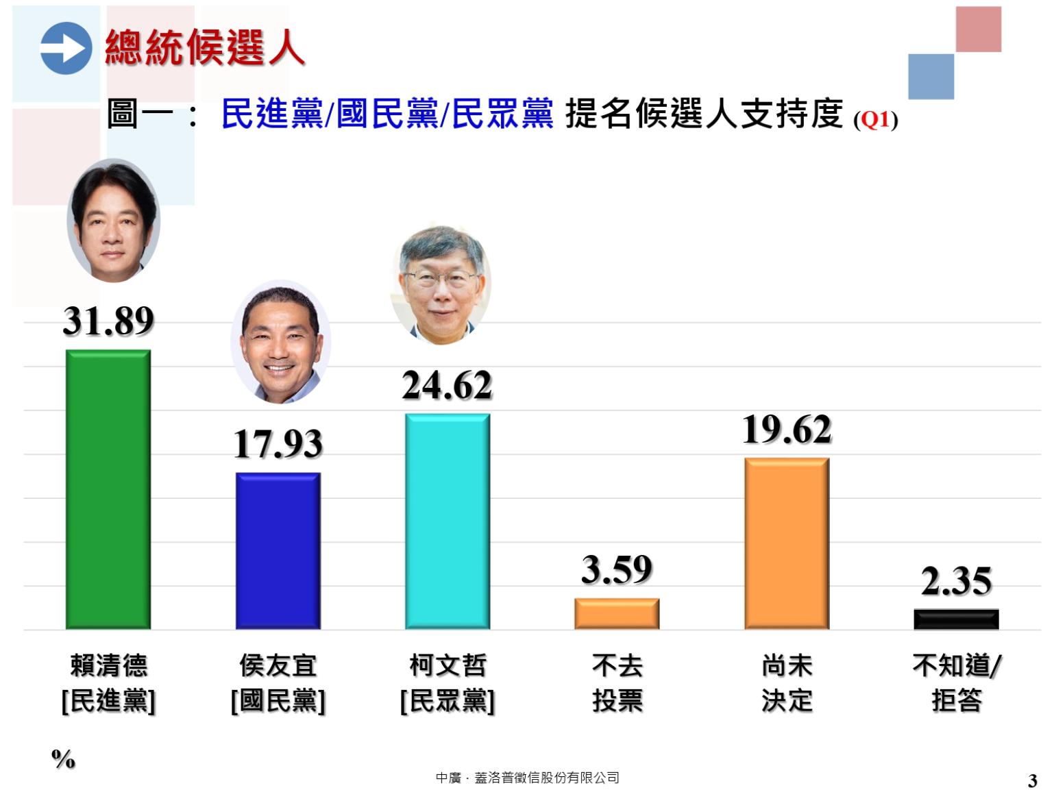 《中廣-蓋洛普》今(21)日發布最新2024總統大選民調,民進黨總統參選人賴清德獲31.89%、民眾黨總統參選人柯文哲24.62%、國民黨總統參選人侯友宜17.93%居末。