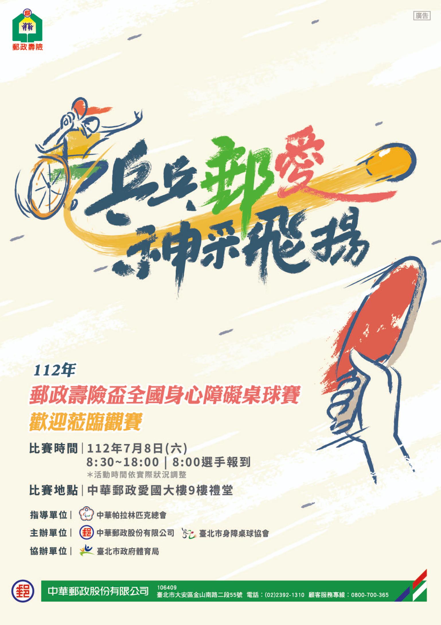 為推廣全民健康運動,中華郵政公司與臺北市身障桌球協會訂於112年7月8日上午8時30分在中華郵政公司愛國大樓9樓禮堂舉辦「112年郵政壽險盃全國身心障礙桌球賽」。