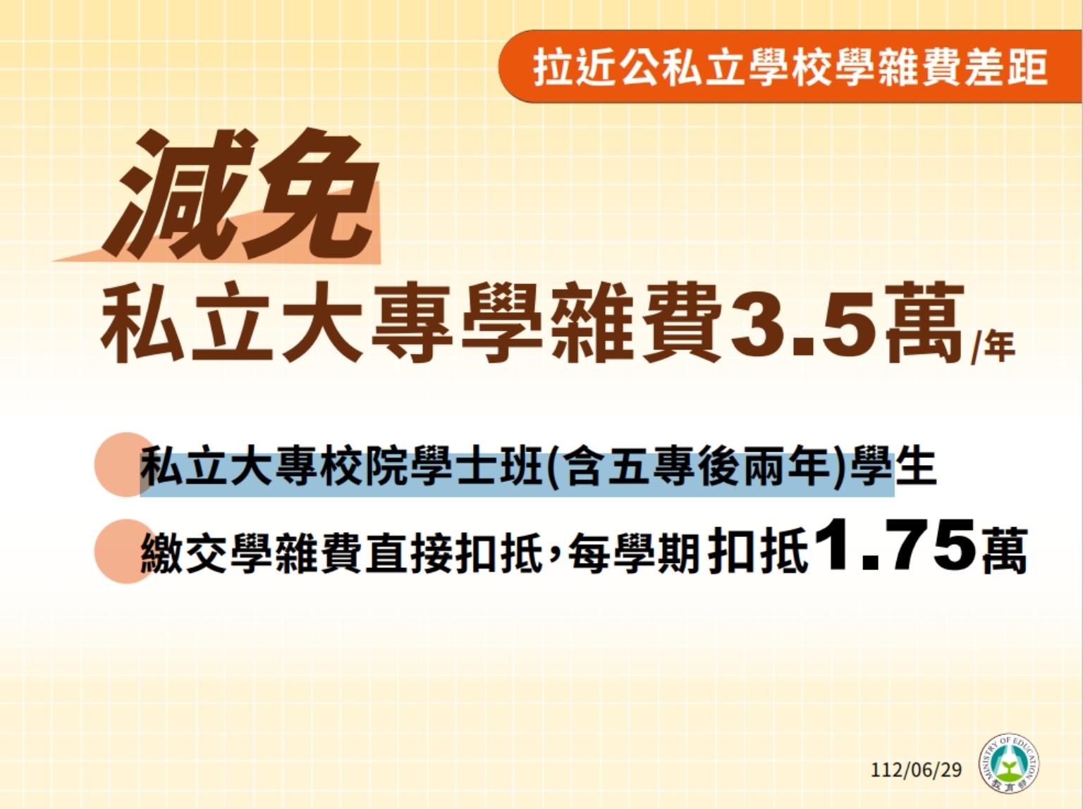 其中,減免私立大專學雜費一年3.5萬,對象為私立大專校院學士班(含五專後兩年)學生,繳交的學雜費註冊單上會直接每學期扣抵1.75萬。