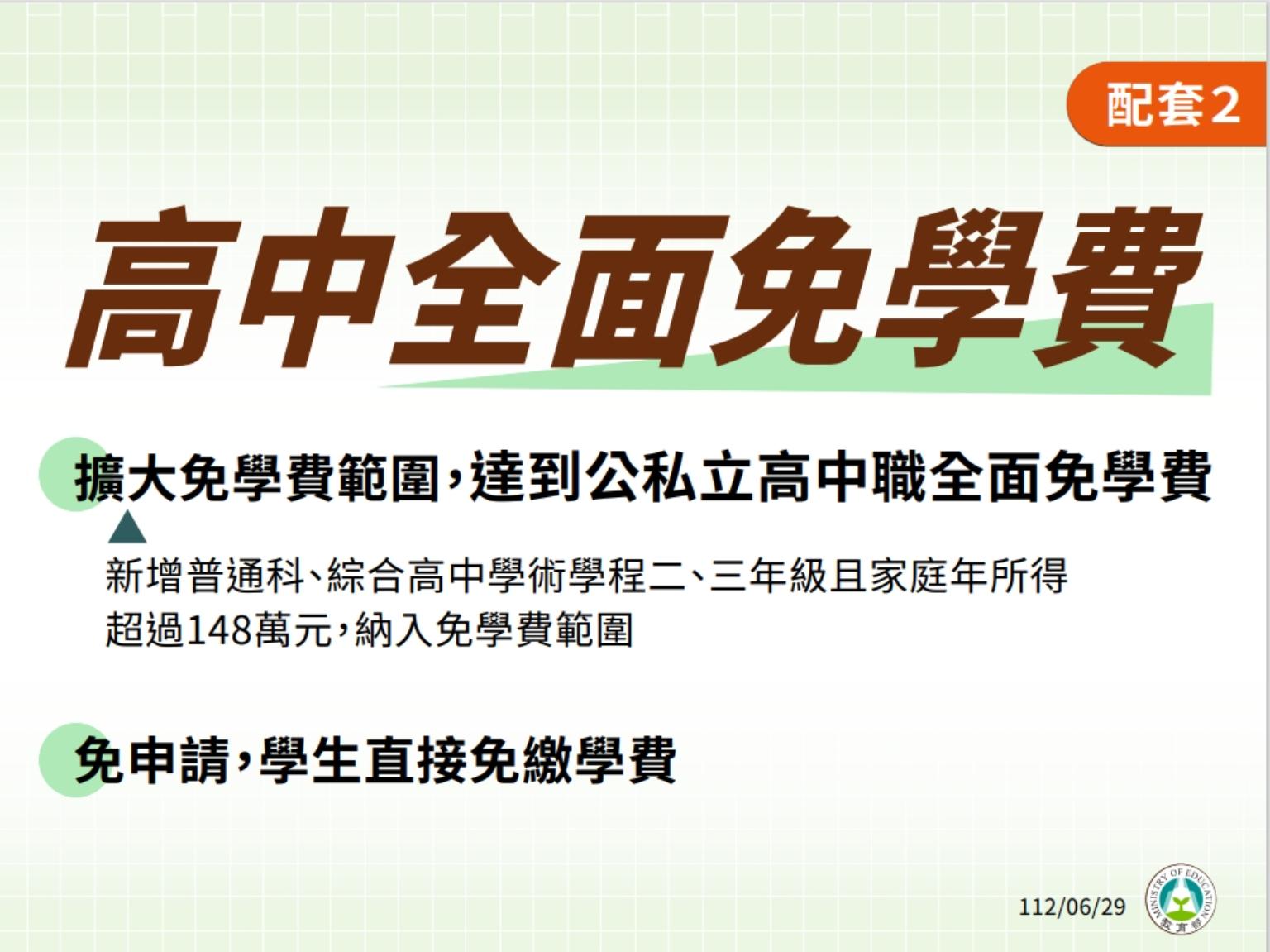 全國高中職免學費則無需申請,學生直接免繳。潘文忠說明,現行公立高中職一年為1.2萬,私立為3.6萬,過去其實就已經實施家庭年所得148萬以下高中職免學費,這次是直接把148萬的門檻拿掉,因為考量到現在高中職很普遍幾乎是國民教育,所以認為在推動教育平權不應該是看孩子是來自怎樣的家庭,才做這樣的配套改變。