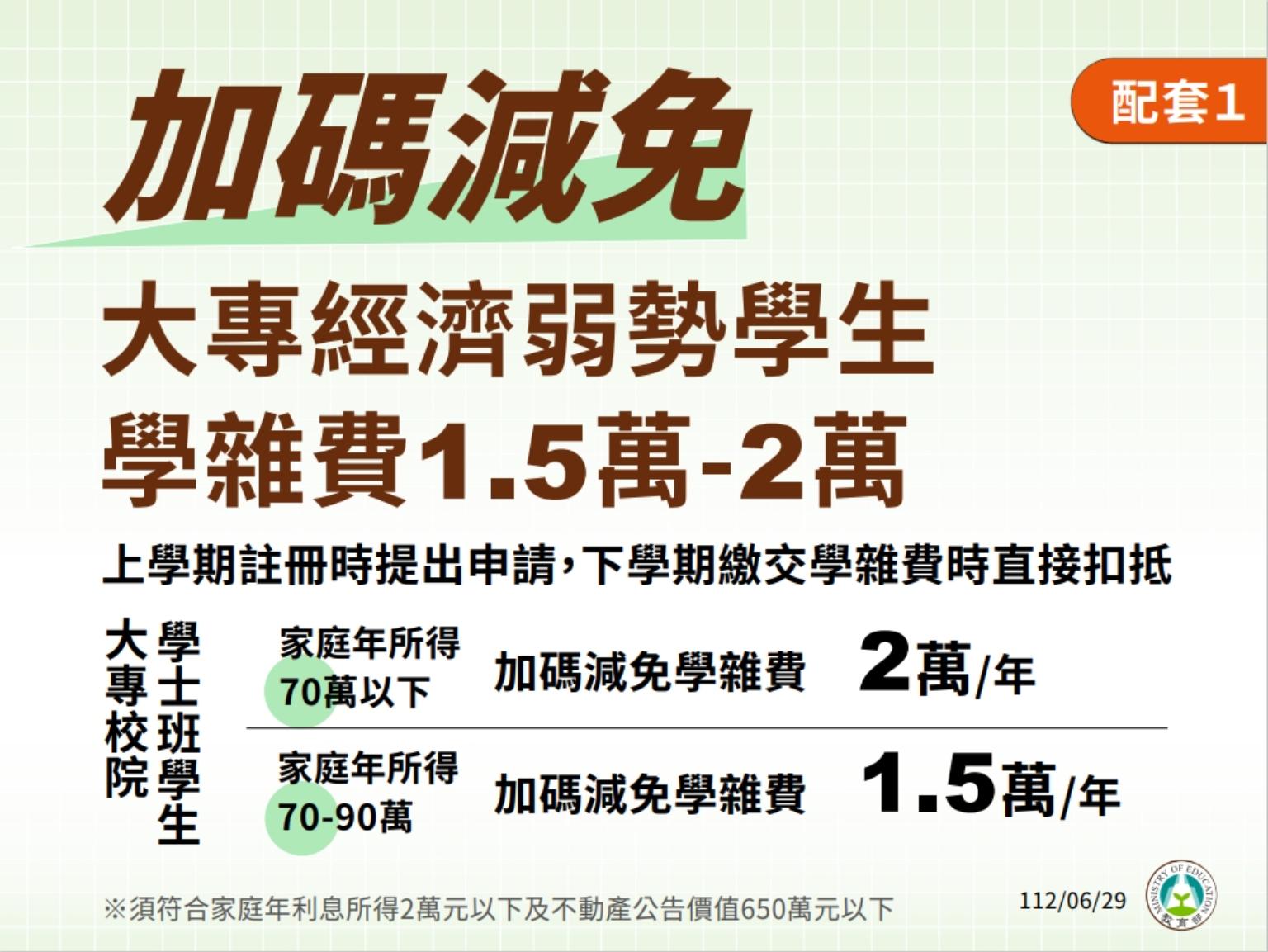 在加碼減免大專經濟弱勢生學雜費部分則不分公私立,只要經濟弱勢學生都可以提出申請,若家庭年所得在70萬以下,加碼減免學雜費一年2萬元,家庭年所得在70至90萬則加碼減免學雜費一年1.5萬。