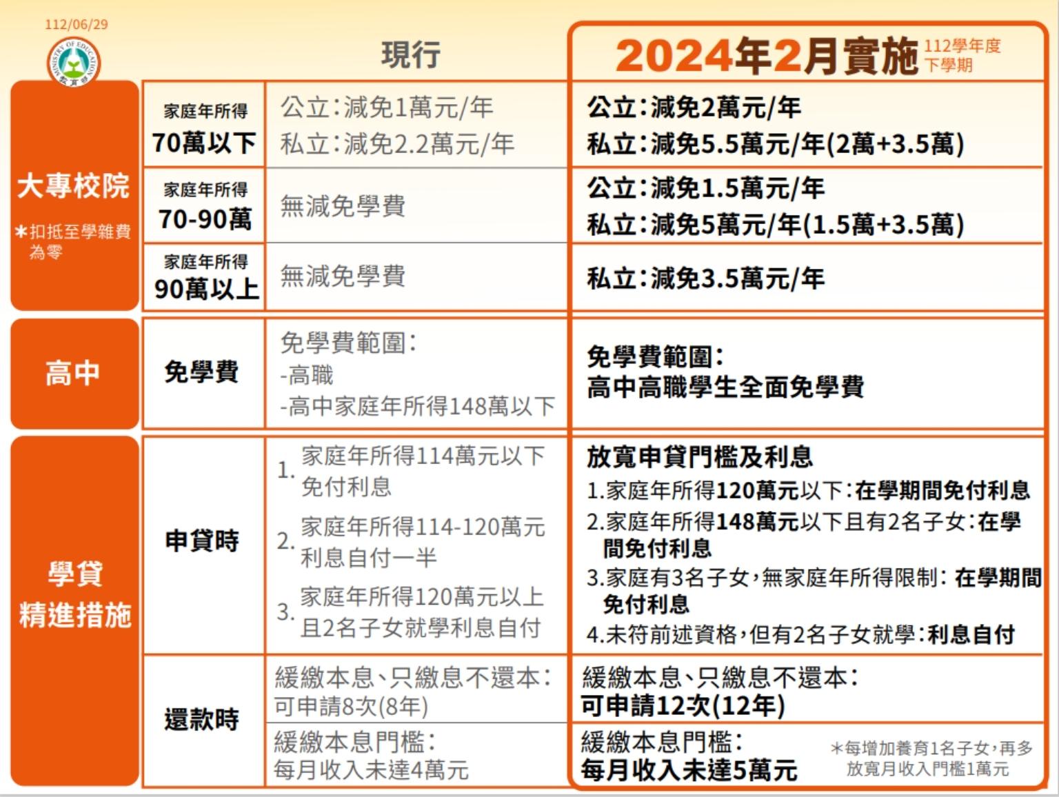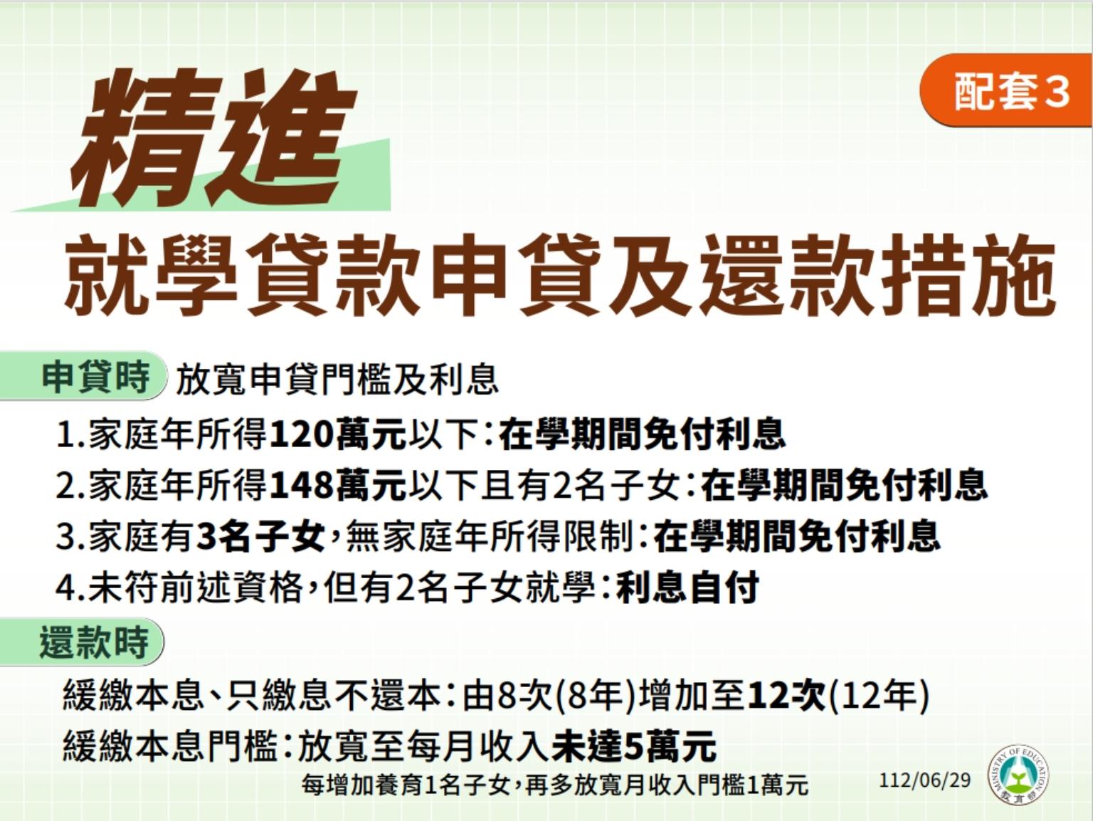最後是精進就學貸款申貸及還款措施,在申貸時放寬申貸門檻及利息,包括家庭年所得120萬元以下、家庭年所得148萬以下且有2名子女、3名子女無家庭年所得限制均在學期間免付利息。