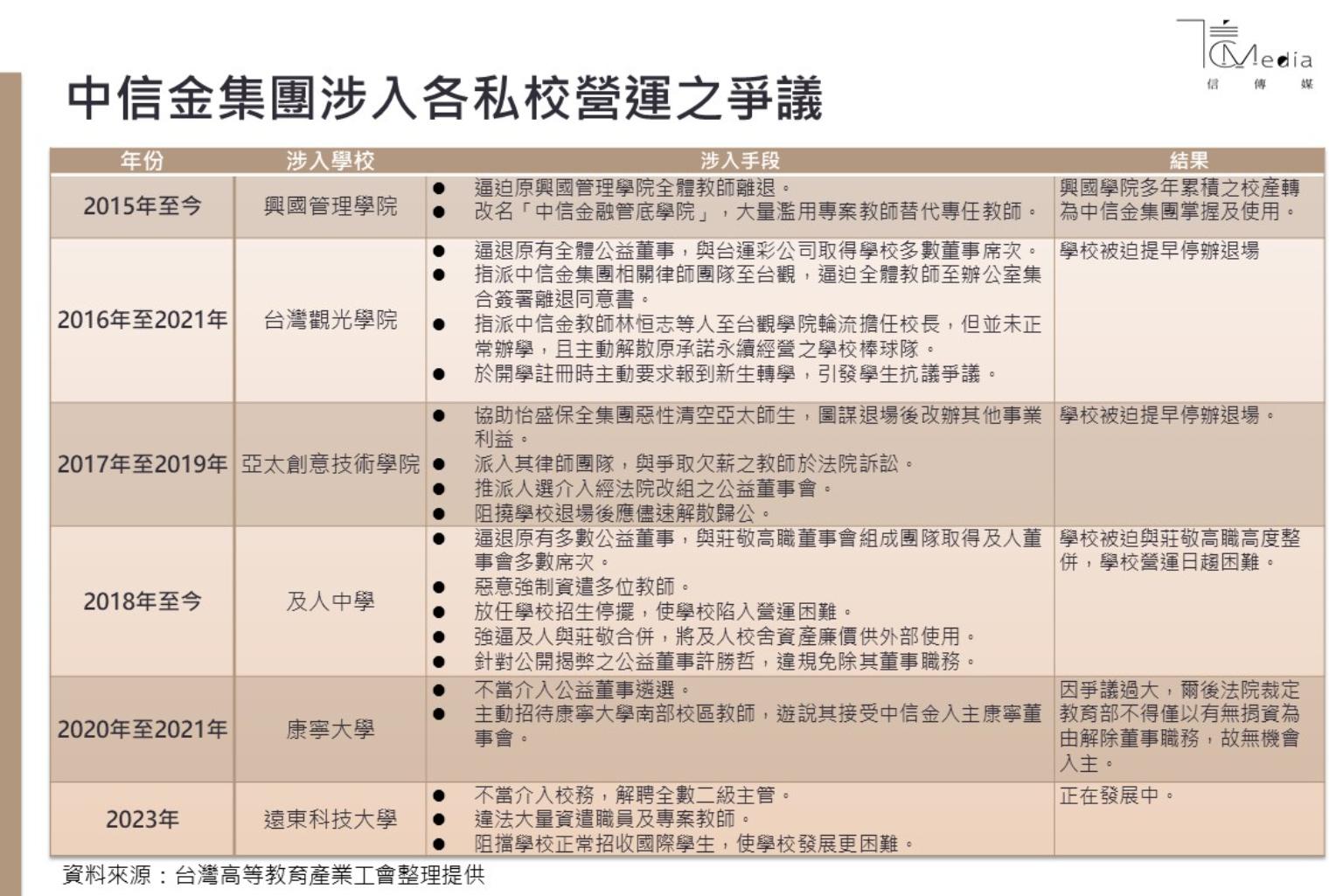 此外,媒體也曾披露中信金集團甚至跨足私立中學爭議,強逼及人中學與莊敬合併,高教工會盤點共5間大專院校、1間私立中學,都被同一個集團用類似的手法進場不正當處理。