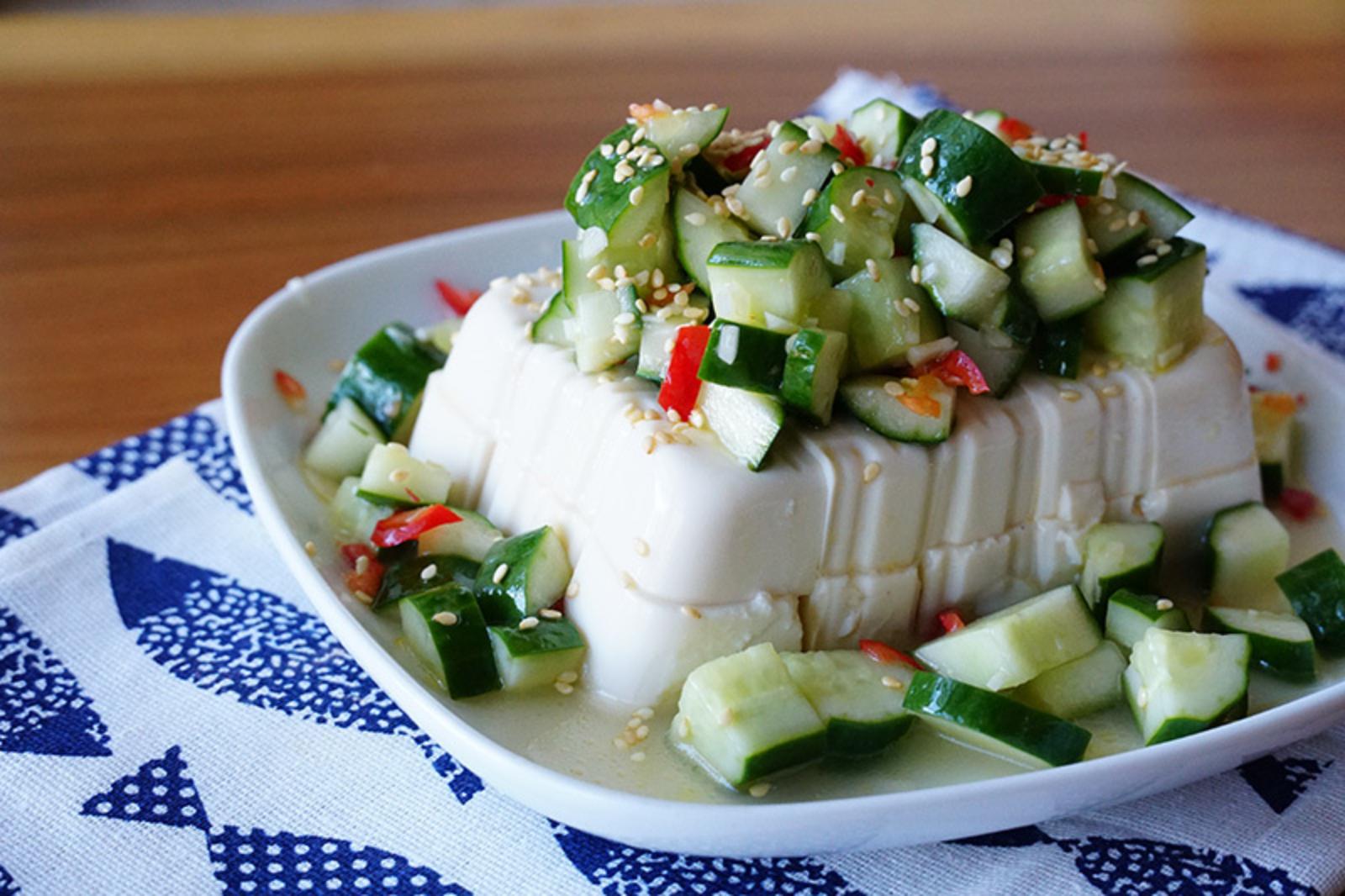 將調味小黃瓜鋪在豆腐上。最後再撒上白芝麻就完成了。