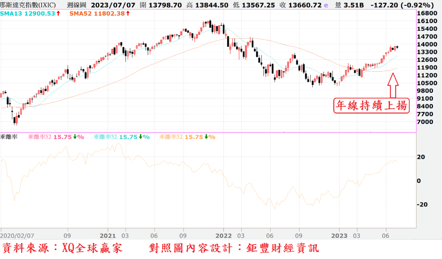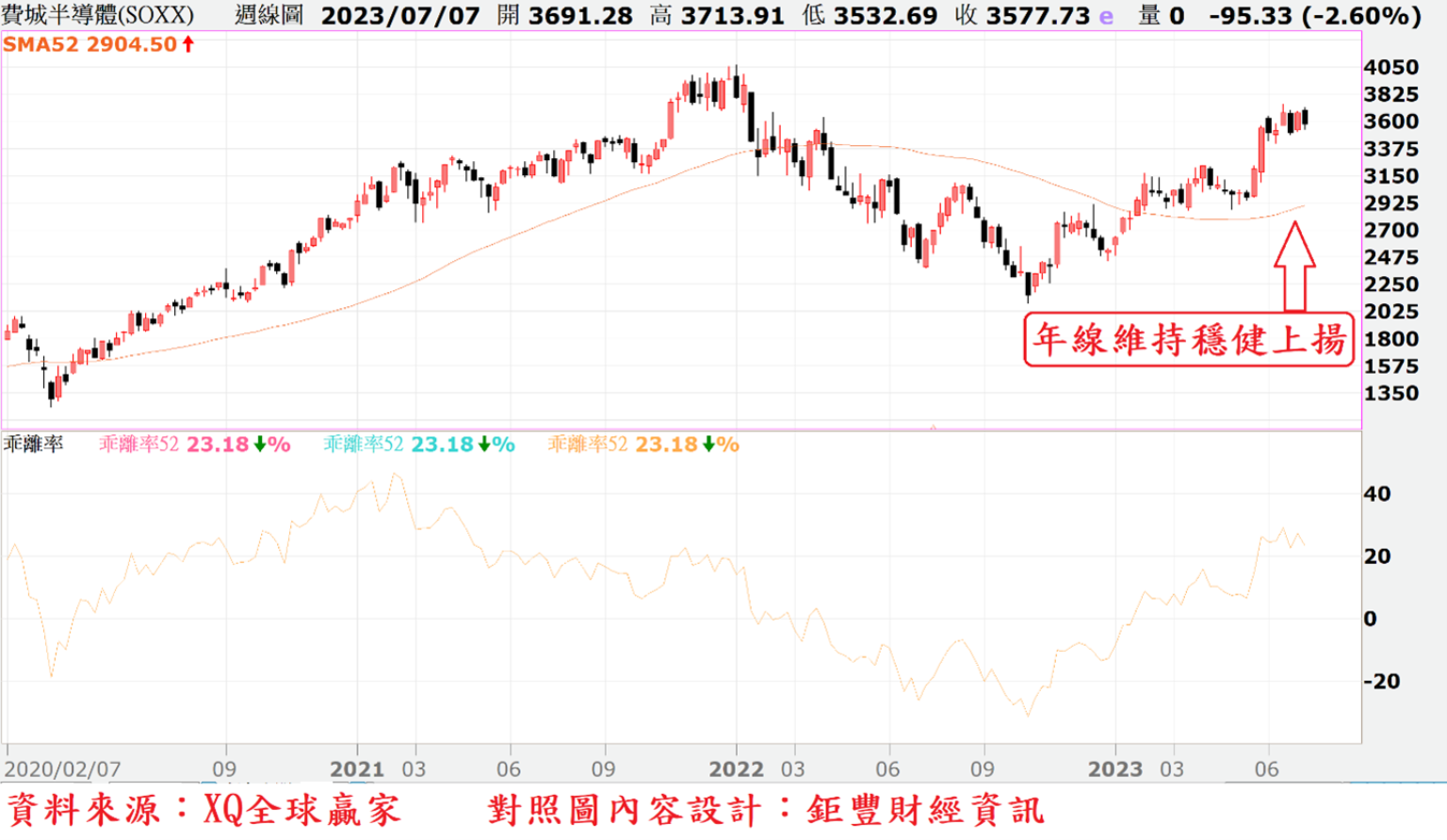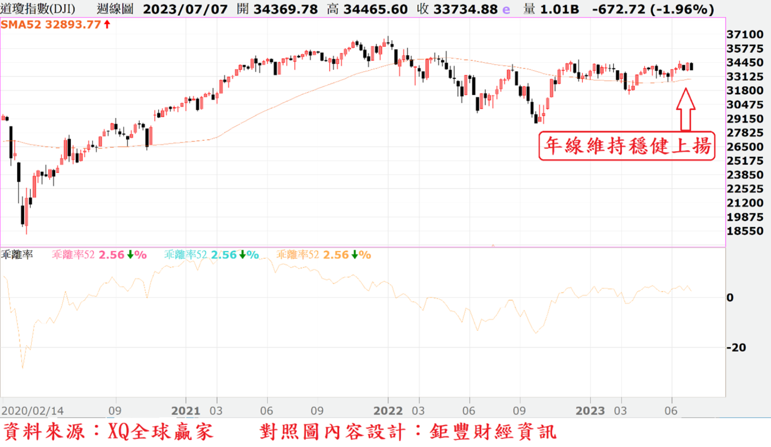 美股指數年線自5月由降轉升後,截至7月上旬,仍呈現穩健上升趨勢,從趨勢型態觀察,仍屬多頭型態。