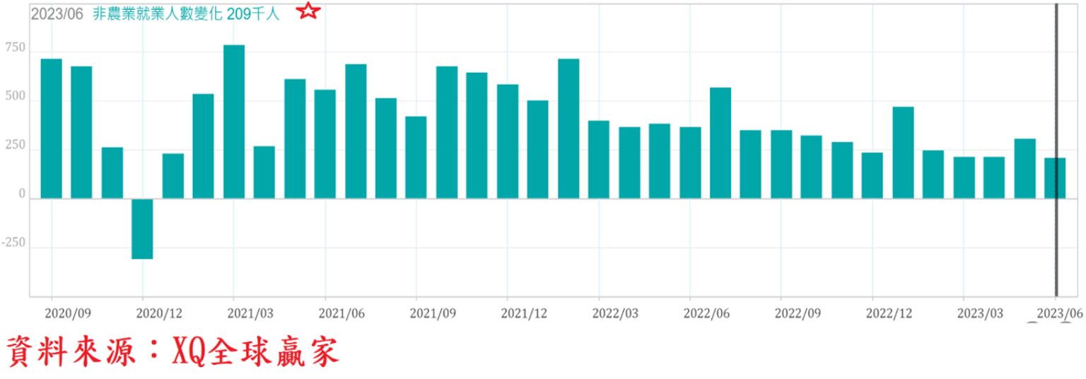 美國就業市場雖維持熱絡狀態,但平均每小時工資年增率自2022年3月的5.92%,下降至2023年6月的4.35%,呈現緩降趨勢仍未改變。