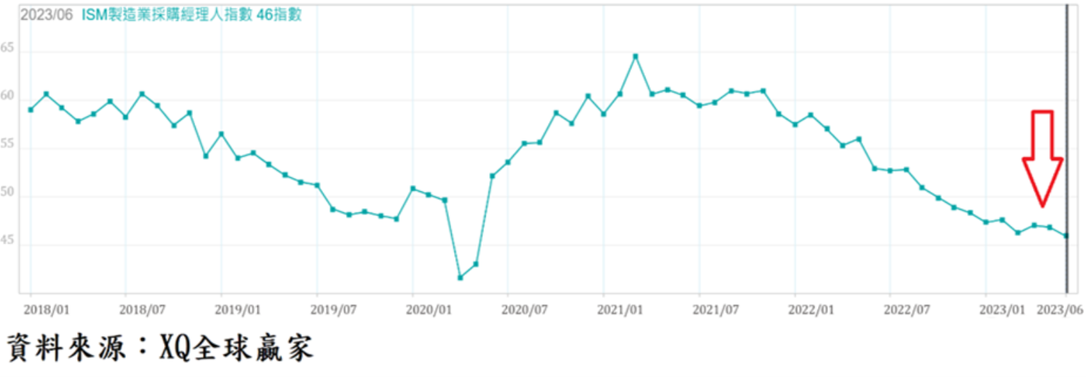6月ISM製造業採購經理人指數自5月的46.9下降至46.0,創2020年5月後最低點,連續8個月跌落50臨界點,顯見美國製造業景氣自2022年第二季以來的下行態勢仍未改變,美國整體製造業產值占GDP產值雖不到二成,但製造業積弱不振,隱含整體經濟失衡與空洞化危機,已是美國長期經濟穩定的一大隱憂。