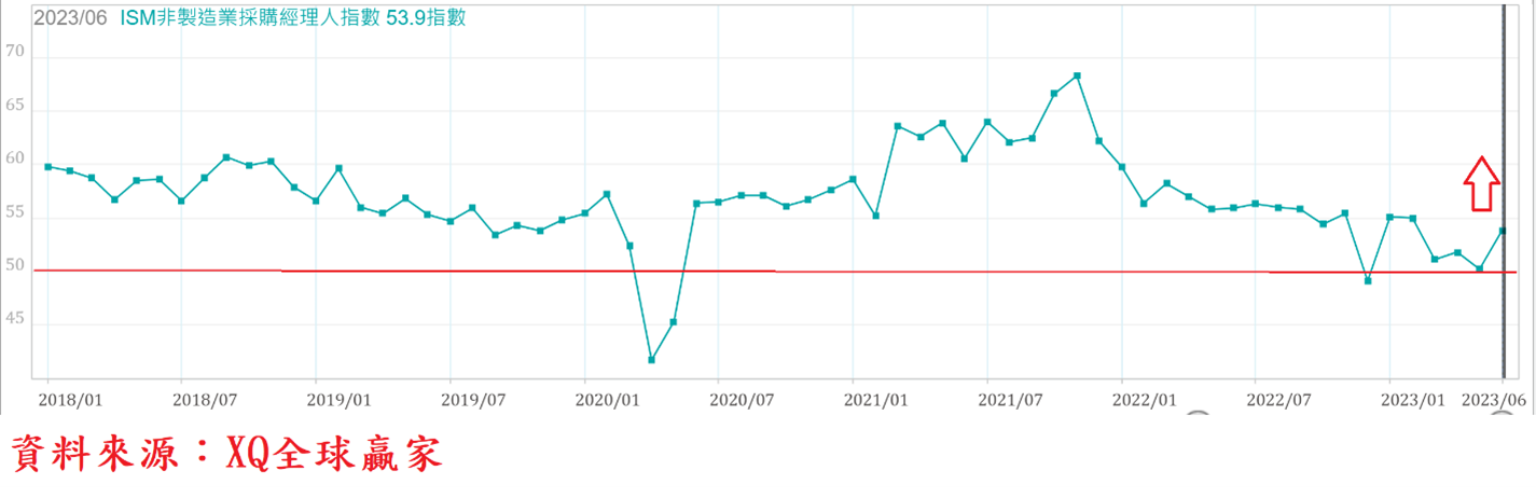 美國非製造業採購經理人指數(ISM)6月自5月的50.3上升至53.9,創近4個月最高點,暫時脫離跌落50的景氣擴張與衰退臨界點危機,整體服務業產值佔美國GDP比重超過八成,服務業維持在景氣擴張狀態,讓美國總體經濟景氣避免走入衰退窘境,但拉長觀察期間,單月的反彈仍無法確認自2021年11月以來的下行趨勢已改變。