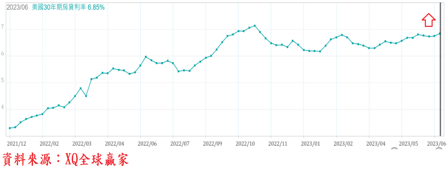 美國30年期房貸利率自2022年11月的高點7.14%,下降至2023年2月的6.18%,截至6月30日當周為6.85%,創2022年11月後最高點,房貸利率目前仍在金融海嘯後相對高檔區,對新購屋者融資成本壓力仍相當沉重,對房市買盤造成壓力,美國房市景氣是否維持下行趨勢,對總體經濟景氣有重大影響。