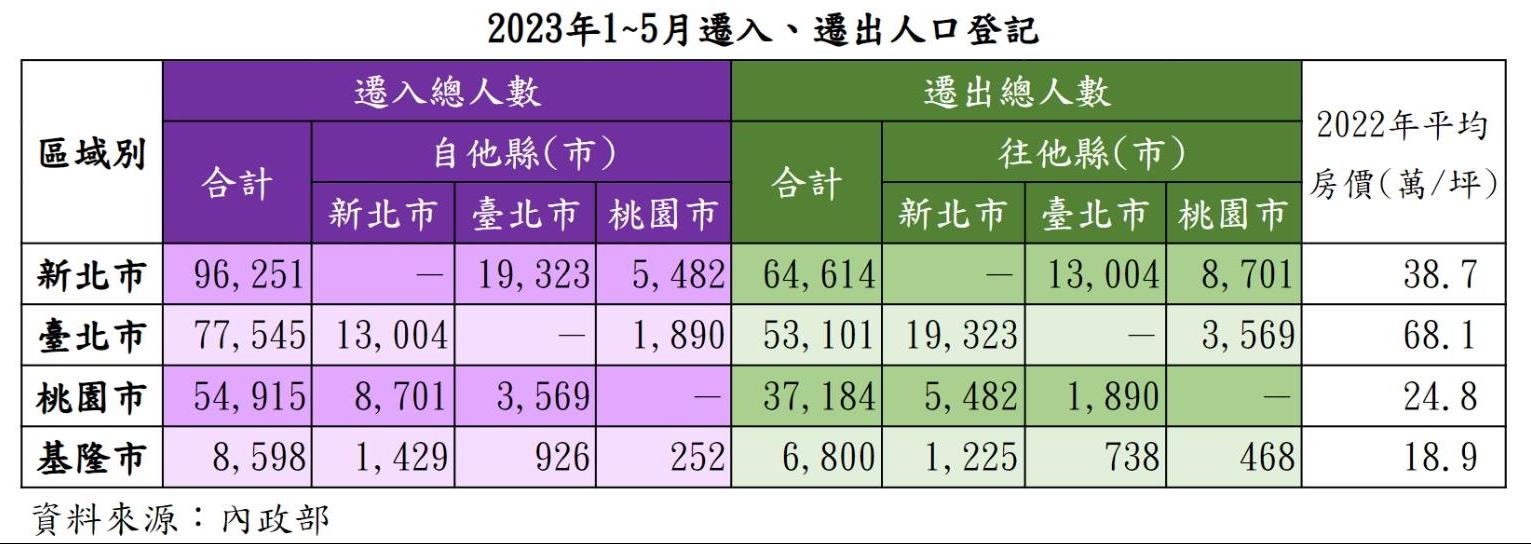 根據內政部人口遷移資料,北北桃基生活圈的四個縣市今年1~5月人口皆為淨遷入(遷入人口多於遷出人口),其中台北市遷往新北市人口高達1萬9,323人,本月北北基桃通勤月票TPASS啟用,許多民眾預期將北北桃基人口可能會因此再現變化。