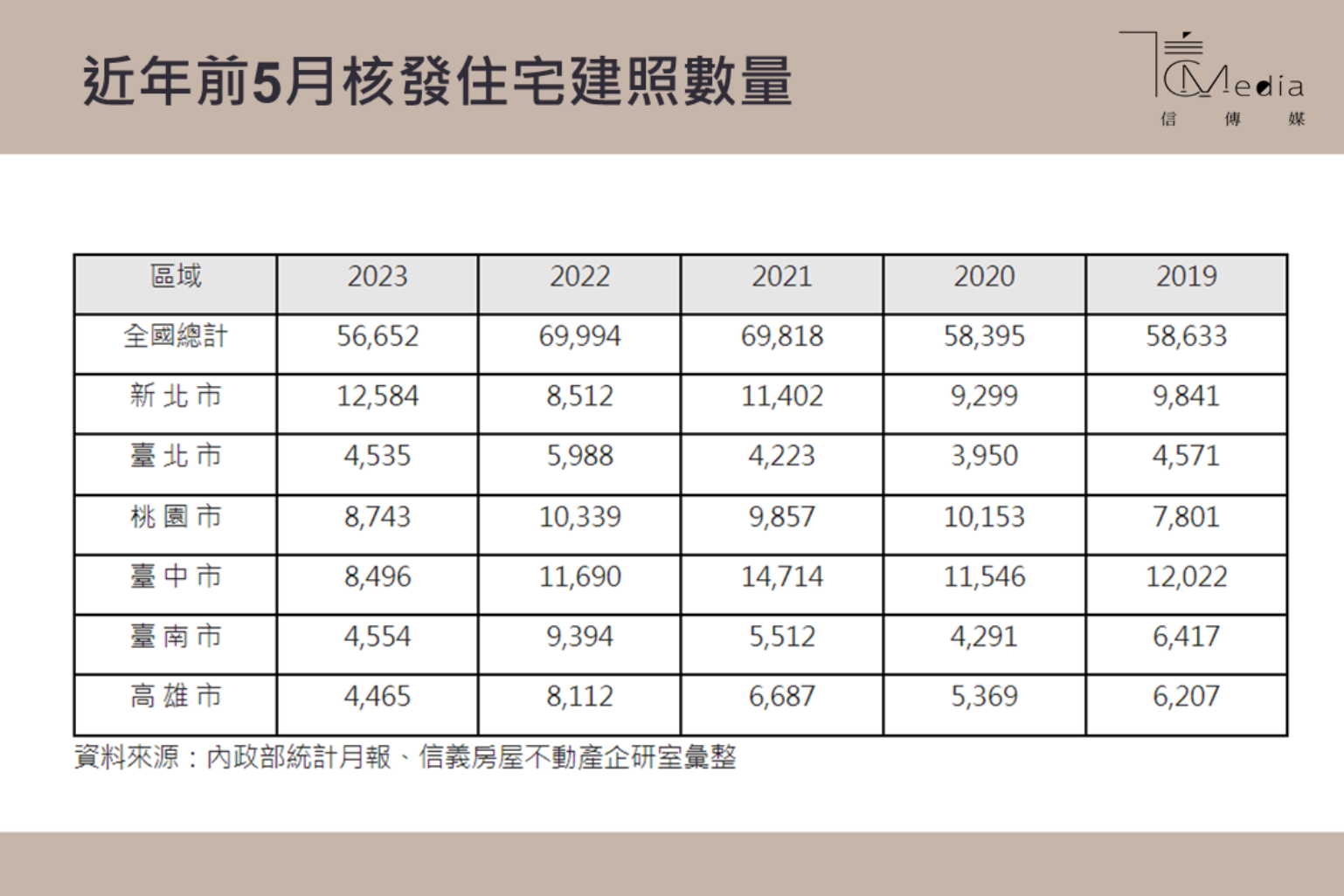其中今年前5月核發數量最多的是新北市,數量甚至寫下五年同期最高的1.26萬戶,擠下過去四年數量都領先的台中市;台中市前5月則是近5年同期首見不到1萬戶,區域房市似有熄火的跡象;不到5000戶的則有台北市、台南市與高雄市,量縮最大的則是科技業投資退燒的南部地區,高雄市前5月核發建照數量4465戶,年減45%,台南市4554戶年減52%。