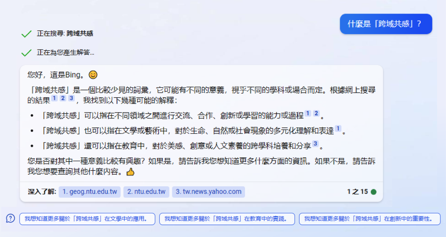 然而,就鄭毓瑜的觀察,ChatGPT 或 Bing Chat 多是提供定義式的短語,回覆的內容主要是「已知」的有限資訊,難以「多義性」的語言表現感知複雜的人類思維。這是因為 AI 的訓練出自設計者目前的偏好或定見,如果想讓 AI 更貼近人類需求,就必須仰賴人類持續更新且多樣化的經驗。