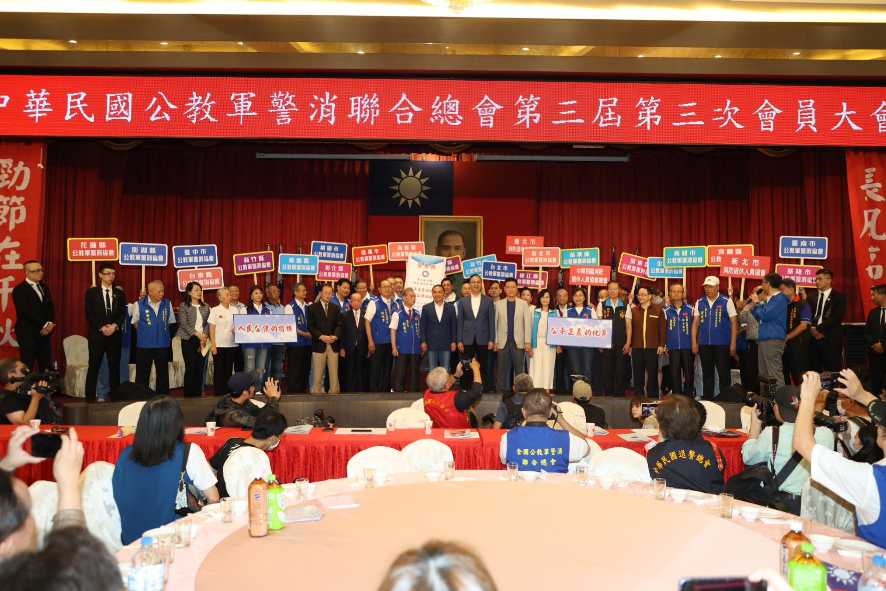 今天的「挺侯大會」上,公教軍警消總會動員數百會員與會,總會長劉盛良、副總會長林水吉、立法院前院長王金平、台北市長蔣萬安、中廣董事長趙少康、財經立法促進院名譽董事長張平沼、組發會主委許宇甄、組發會社會部主任水雲翔等藍軍要角都踴躍出席。