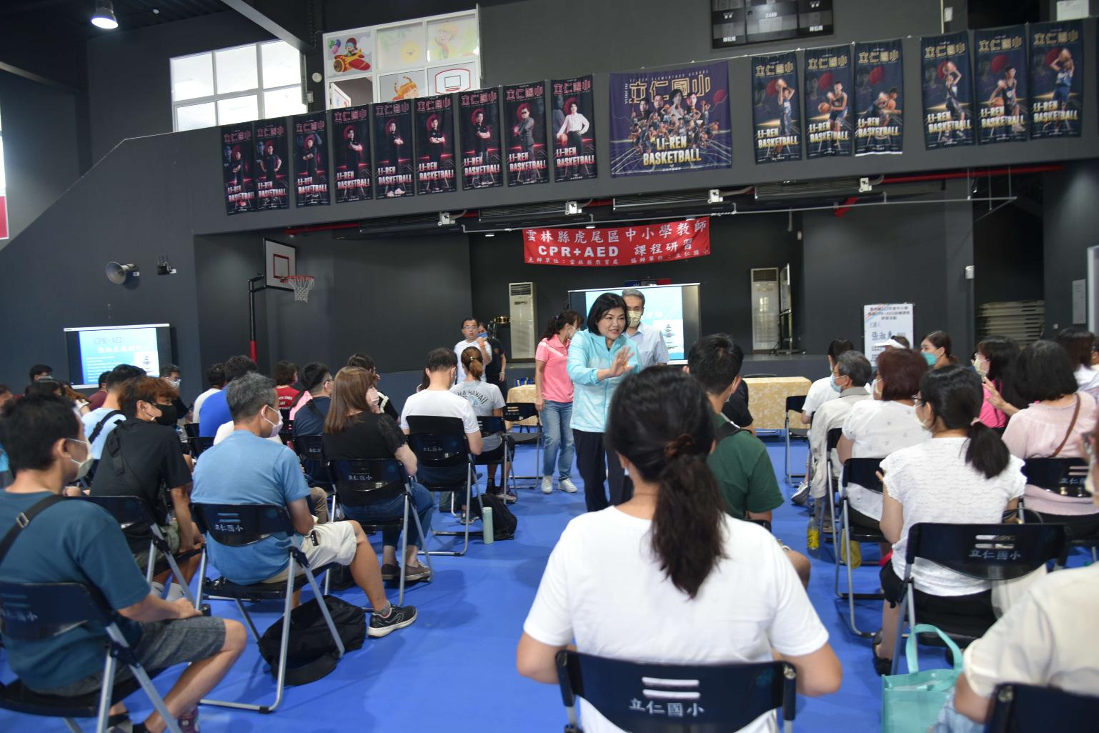 「112年度雲林縣國中小學教師CPR+AED研習」首場10日上午於虎尾鎮立仁國小舉辦,縣長張麗善在教育處長邱孝文陪同下到場勉勵培訓教師,預計2160位本縣教師能透過研習取得急救教育認證,未來縣府將持續辦理本計畫,目標是全縣教職員都能取得認證,並融入學校課程教學,建立學校安全環境,更養成緊急救護種子。