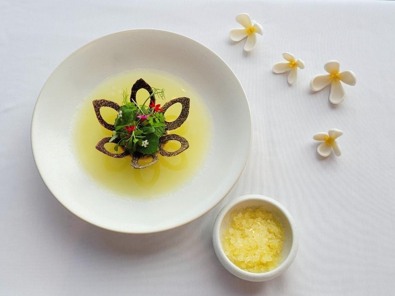 不可錯過的還有本季菜單的夏日甜點,巧妙融合台灣特色食材與法式甜品,「新鮮鳳梨酥/水牛莫札瑞拉/日本柚子/芝麻葉」以傳統糕點鳳梨酥為概念,鳳梨酥外殼是杏仁香草酥,餅殼內含杏仁巧克力酥餅、鳳梨醬、鳳梨果餡三重奏。鳳梨酥上面鋪上柚子雪酪,將鳳梨酥搭配雪酪一同享用,沁涼消暑。「法式焦糖布丁/青蘋果/茉莉花茶/70%黑巧克力」以杏仁奶及豌豆奶製成焦糖布丁,上面鋪上一層焦糖果凍,底部則是用選用來自彰化花壇的茉莉花茶加上青蘋果及西谷米製成的冷湯,食用花草的下方是青蘋果餡,旁邊是酥脆的茉莉花茶酥菠蘿,每口都有不同層次口感,創造獨具夏日印象的味覺體驗。