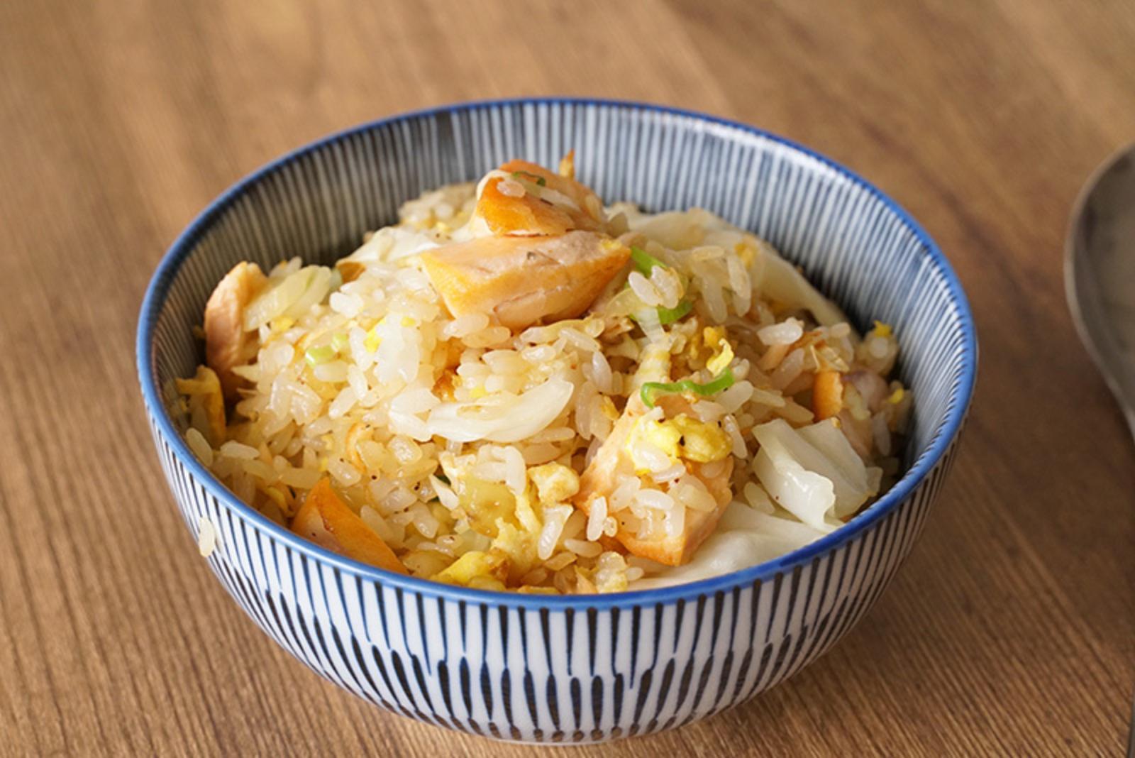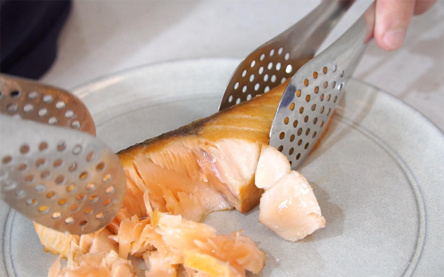 鮭魚煎過後,剝成適當大小的鮭魚碎。