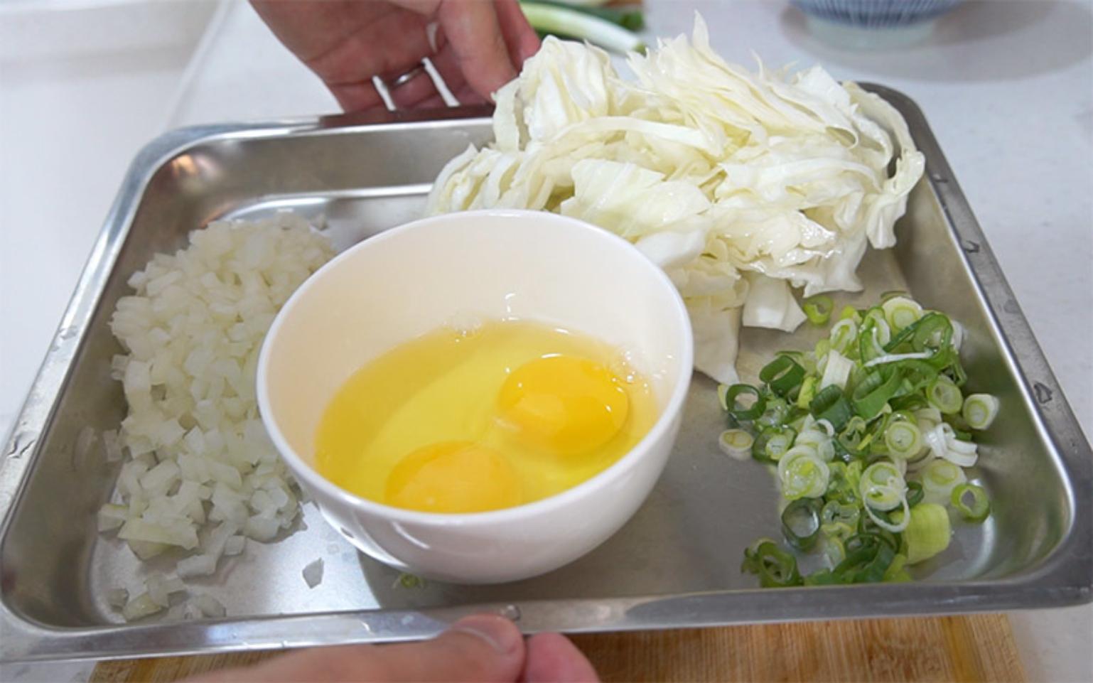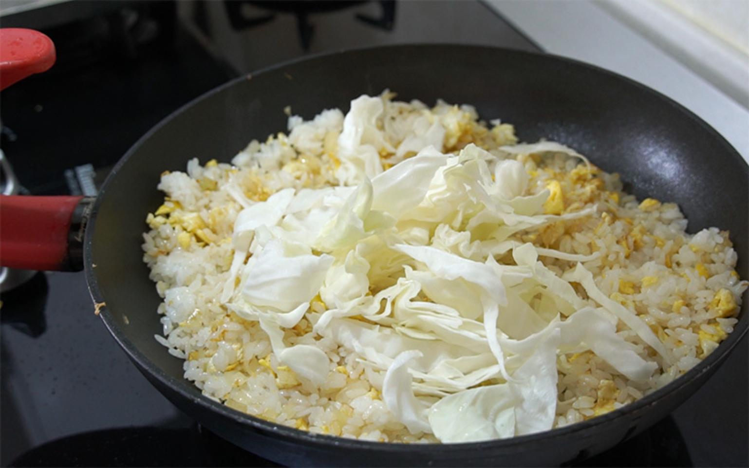 炒飯最重要的工作就是備料。先切好洋蔥碎、蔥花,高麗菜切小片,之後下鍋炒就很快。