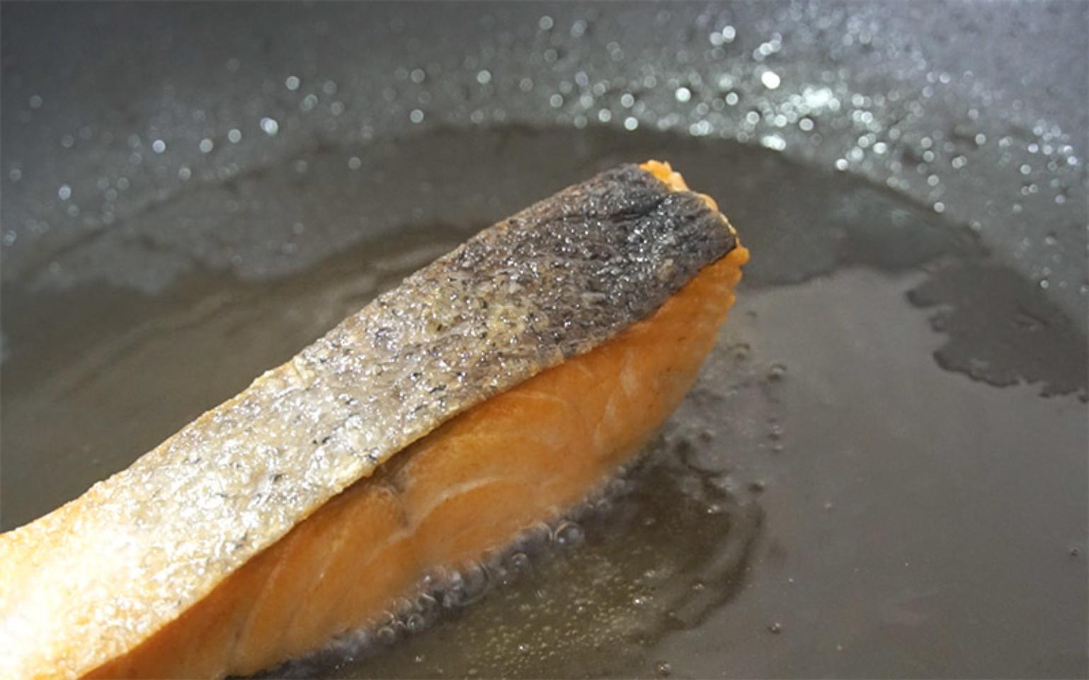 鮭魚部分,加入一點鹽巴調味後,下鍋將鮭魚煎熟煎香。