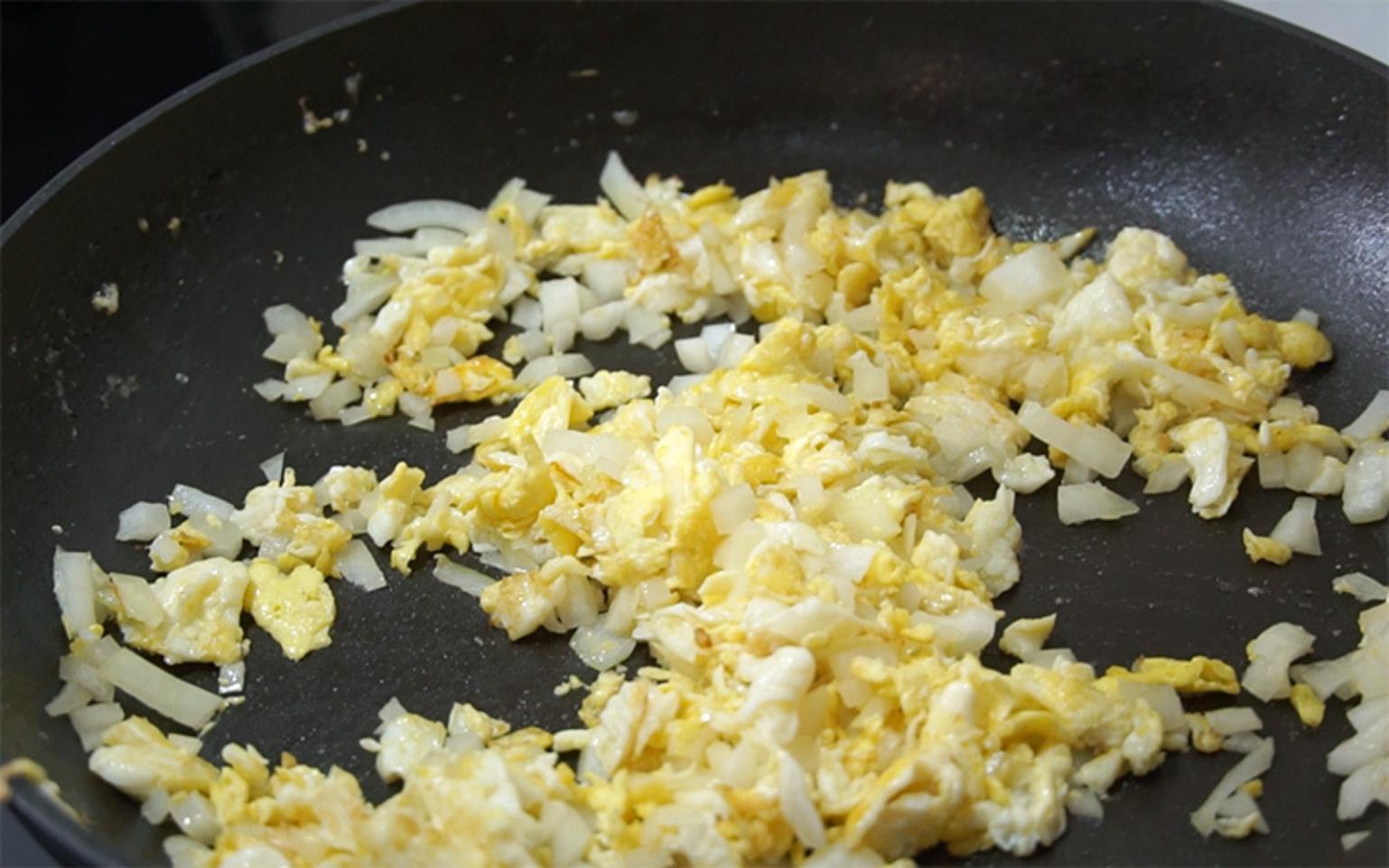 利用煎鮭魚剩下的油來炒飯。雞蛋先下鍋爆香,拌碎。接著加入洋蔥碎一起拌炒,直到洋蔥開始轉黃。
