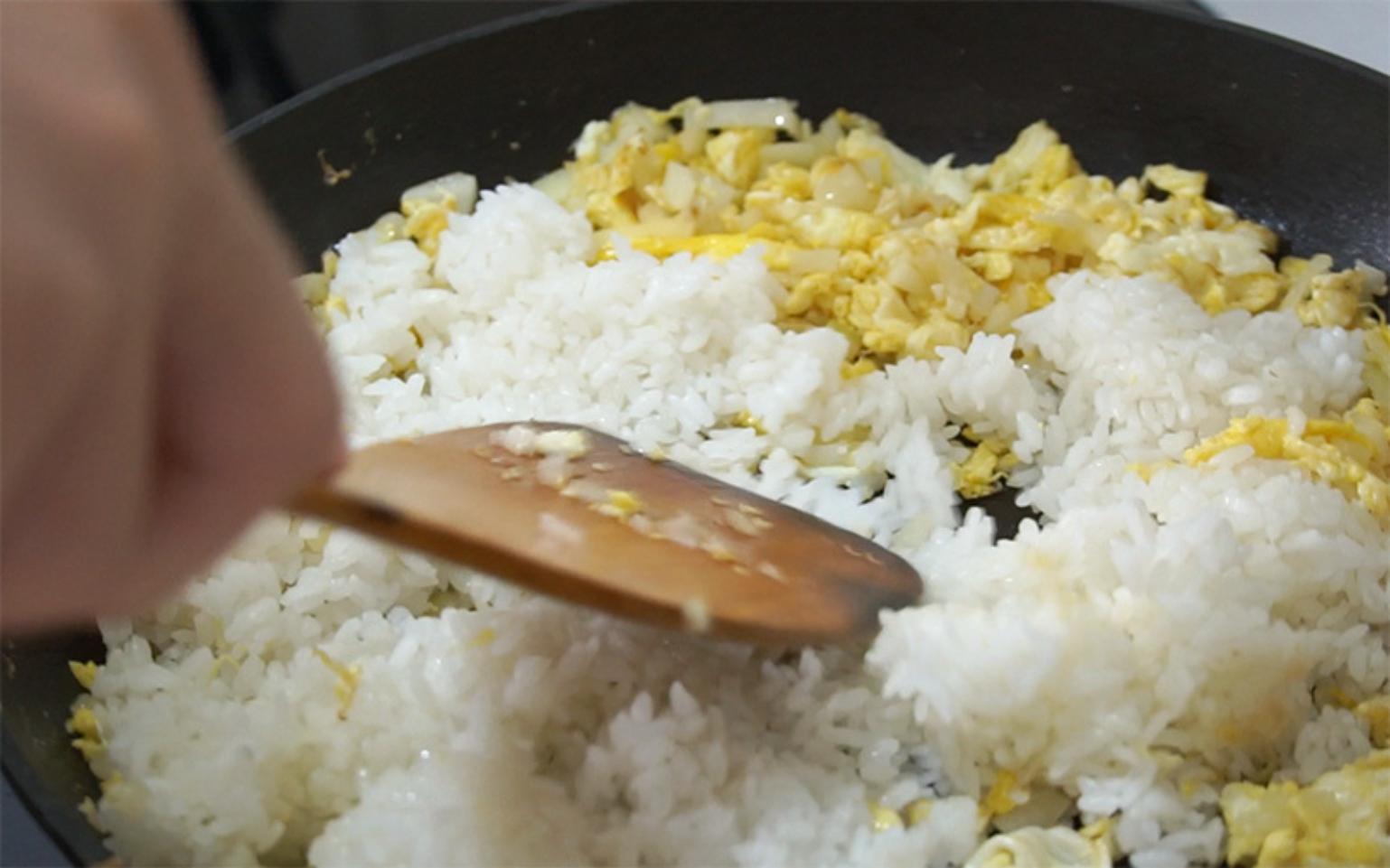接著加入白飯,利用鏟子輕壓輕柔將飯炒開道粒粒分明。