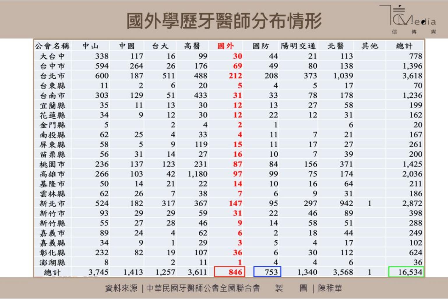 從統計數據來看,外國學歷牙醫師,以台北市212名最多,新北147名居次,第三則是高雄的97名。若從外國牙醫師學歷取得國家來看,則是以波蘭237人最多,菲律賓136人居次,美國94人、西班牙79人居前四名。