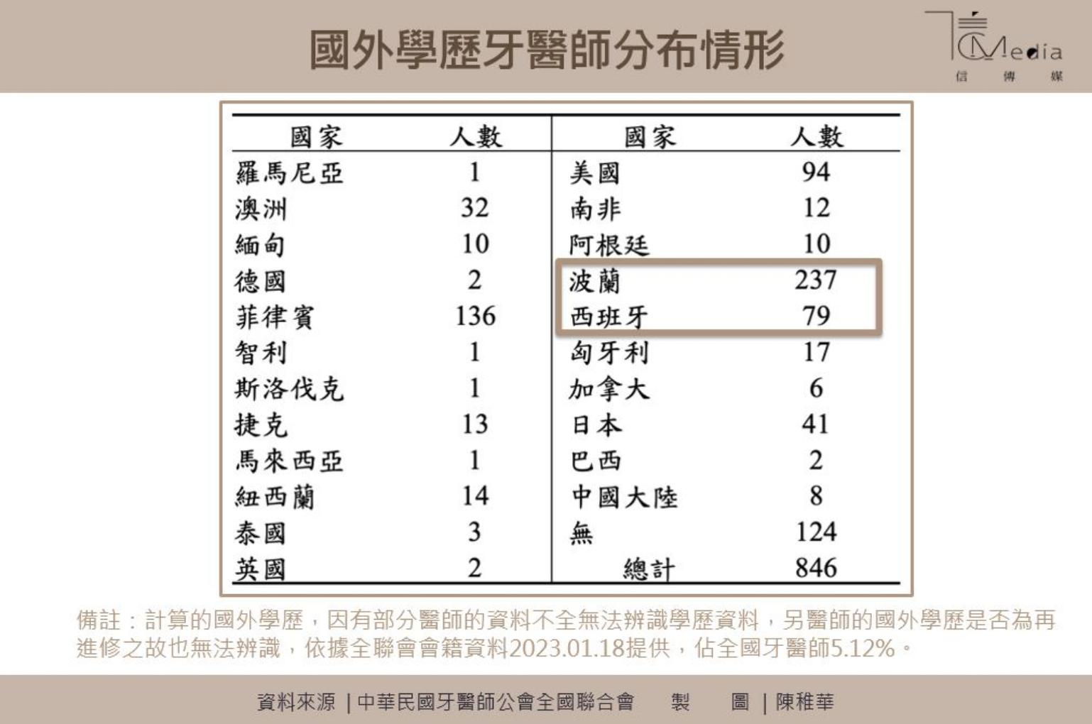 根據牙醫師公會全聯會今年1月18日統計資料顯示,目前在台灣,國外學歷的牙醫師共846名,約佔全國牙醫師總人數的5.12%,其中波蘭與西班牙各佔39%、日本9%、美國5%、其他8%。從波蘭、西班牙、匈牙利等地畢業已在執業的「波波、西西、匈匈」們,共有333人。自從2004年波蘭加入歐盟享有「免學歷甄試」的優惠後,早年流行去菲律賓的台人幾乎都轉到波蘭就學。