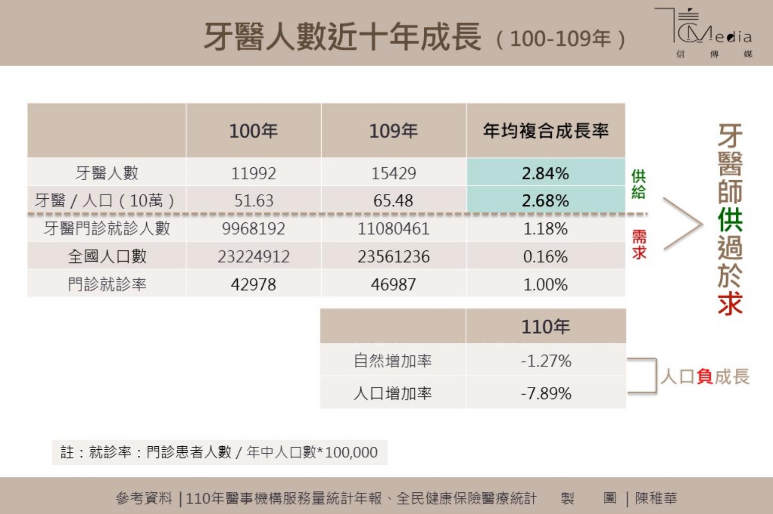 本土牙醫指出,台灣目前的牙醫師人口總數約是1萬6,453多人,這是今年5月的數據,全台醫病比大約是1:1420(全國牙醫師總數:比全國人口總數),且還會再降,因還沒算入今年7月的畢業生。「根據國家衛生研究院及WHO資料,他們認為一個比較健康的醫病比大約是1:1900-2000,其實我們醫師比例已經是比較高的了,且全台總人口數已經在負成長,但醫師的成長人數卻比以前還更快,因為波波進來的人數越來越多,而且舊的人沒有退休。醫師的成長遠大於出生率,這其實是未來這20年可預期的狀況。」