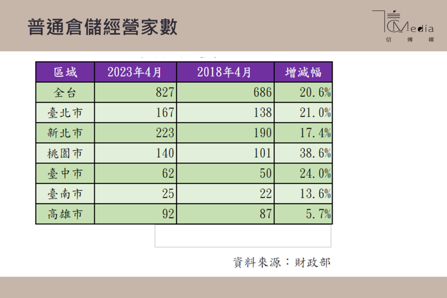 郎美囡表示,普通倉儲的分布主要位於六都,根據最新數據,今年前四月六都普通倉儲經營家數共有709家,佔全台85.7%,其中北北桃的家數就有530家,佔全台64.1%,新北市共223家居冠,台北市共167家,桃園市共140家,北北桃囊括家數前三名,郎美囡指出雙北人口多、公司行號多,對於倉儲的需求高,新北市幅員廣,又有許多工業區,故倉儲數目最多,桃園市有則具備桃園機場及高速公路的交通優勢,因此吸引大型物流倉儲業者布局。