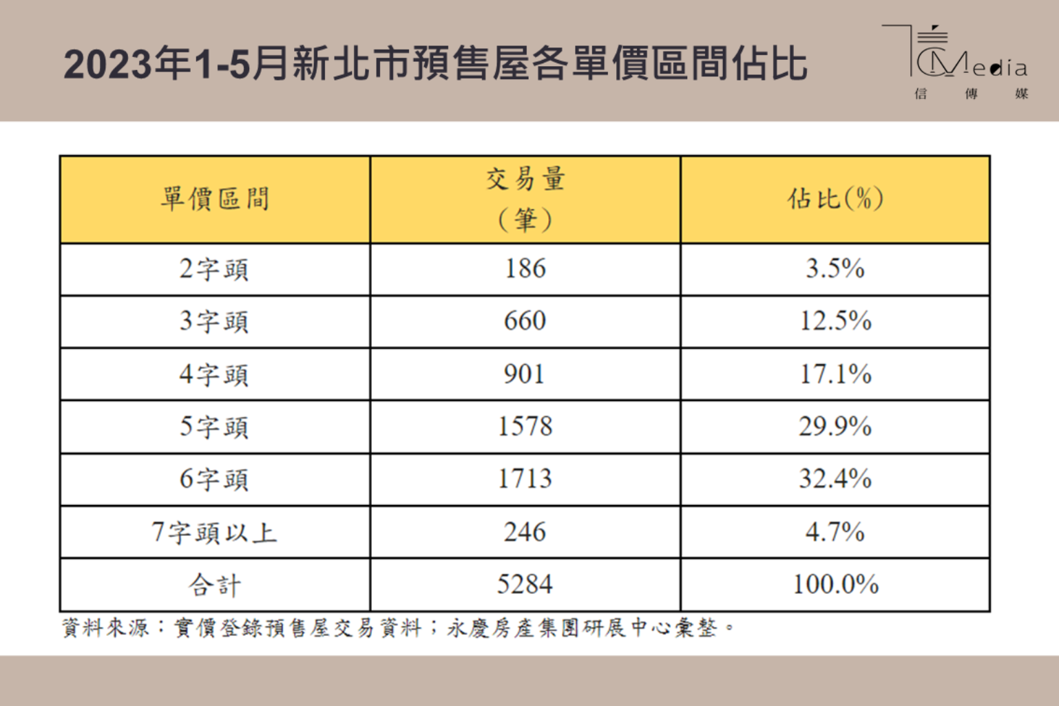 永慶房屋研展中心副理陳金萍表示,近年來,在全球貨幣寬鬆、資金潮挹注下,房市交易火熱,連帶提升民眾對房價上漲的預期,而在原物料、工資成本上升等因素,讓房價居高不下,新北市的預售屋5、6字頭已成主流,連3、4字頭比例加總都未達三成。顯示若想在新北市買到低單價的預售屋,難度恐怕是越來越高。