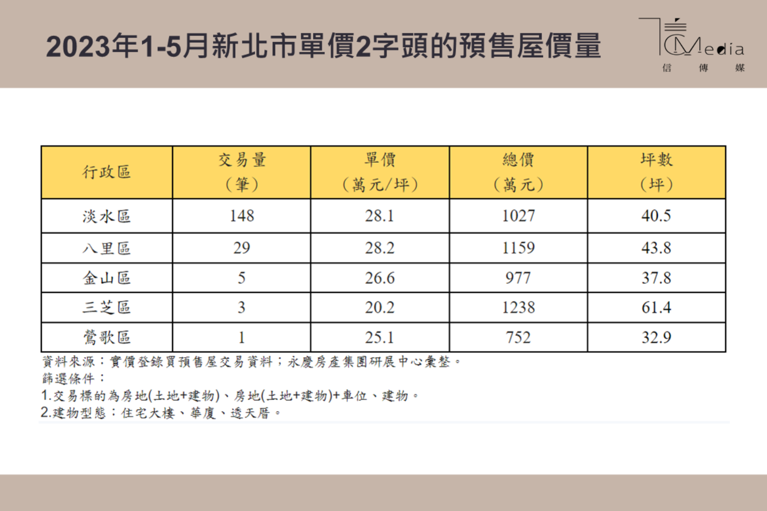 雖然5字頭以上已成為新北市預售屋的主流,但是消費者仍有機會找到2字頭的預售屋!觀察今年1-5月新北市單價2字頭的預售屋交易中,以淡水區交易量148筆最多,平均單價約每坪28.1萬元,其次則是「八里區」的29筆,平均單價每坪為28.2萬元,交易量為29筆。這些2字頭預售屋普遍集中在淡水區、八里區兩地,金山區、三芝區與鶯歌區則有零星個案。