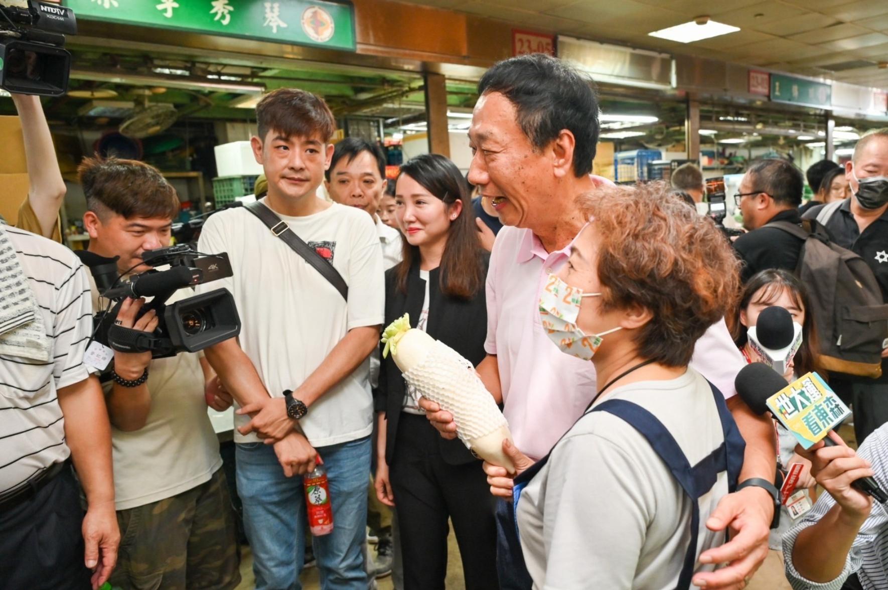 鴻海創辦人郭台銘今(19)日則走入濱江市場,獲得基層熱情歡迎,民眾高呼「總統唯一支持郭台銘」,攤商也紛紛致贈象徵氣勢旺盛的鳳梨,與郭開心合影。