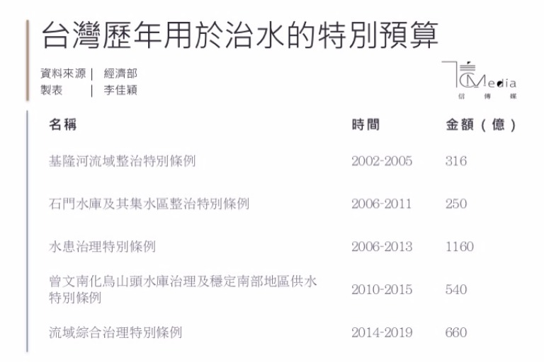 十多年前,即便極端氣候沒那麼嚴重,台灣的降雨量也是世界排名的前段班,河流整治、水患治理已經是相當重要的工作。不管是什麼政黨執政,都曾透過編列特別預算的方式來治水。尤其扁政府時期,在2004年遇上敏督利颱風造成的七二水災,甚至影響到當年的大學指考考生應考。因此,隔年行政院就提出水患治理特別條例,其中要花8年800億的經費來整治易淹水地區。