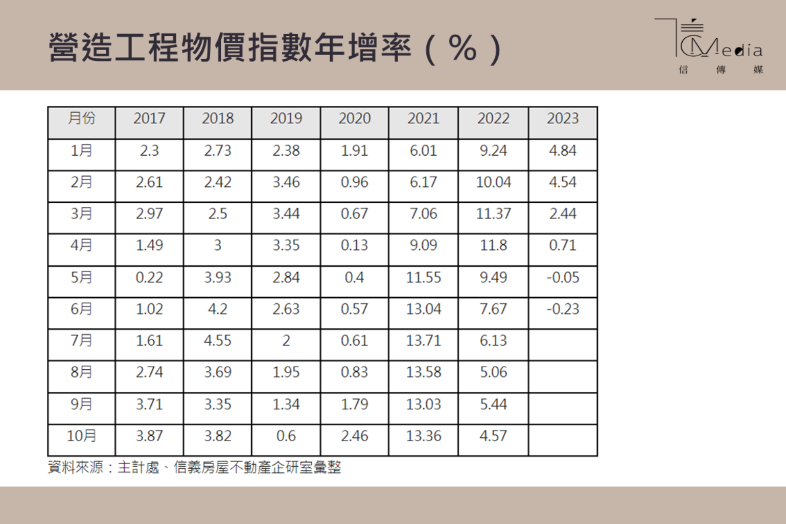 統計顯示,2017~2020平均營造工程物價指數年漲1.42%~3.35%,整體造價還算平穩,不過2021累計平均年增10.94%,2022累計平均上漲7.36%,整個造價呈現大漲走勢,一直到今年前4月仍居高不下,不過5、6月營造工程物價指數年增率是近6年首度開始下滑,5月年減0.05%,6月擴增到年減0.23%,造價漲不動狀況明顯。