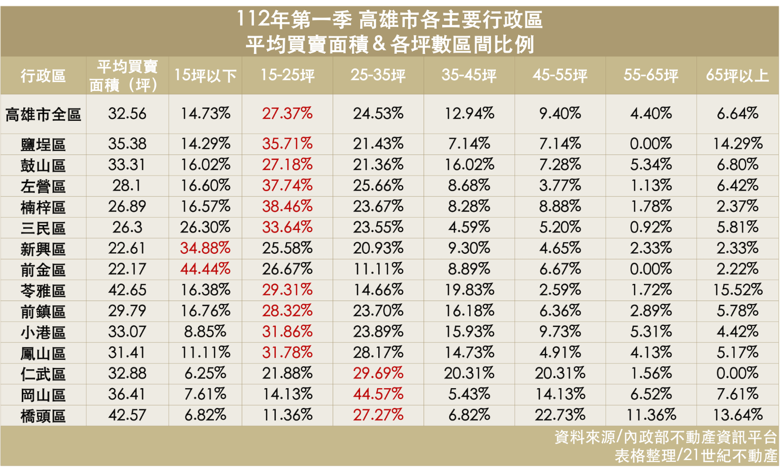根據內政部不動產平台資料顯示,高雄市今年第一季平均買賣面積為32.56坪, 若只看特定熱門的行政區,更可以看出大家愛買小宅的趨勢。首先是區域內有多家科技廠的前鎮區,今年第一季共計有45%的交易落在25坪以下;高雄市人口第二大區的三民區,今年第一季共計有59%的交易落在25坪以下。以高雄市人口密度最高的新興區為例,今年第一季有34.88%的交易落在15坪以下;至於隔壁的前金區,今年第一季則有44.44%的交易落在15坪以下,顯示小坪數的套房產品在人口密集區相當受歡迎。