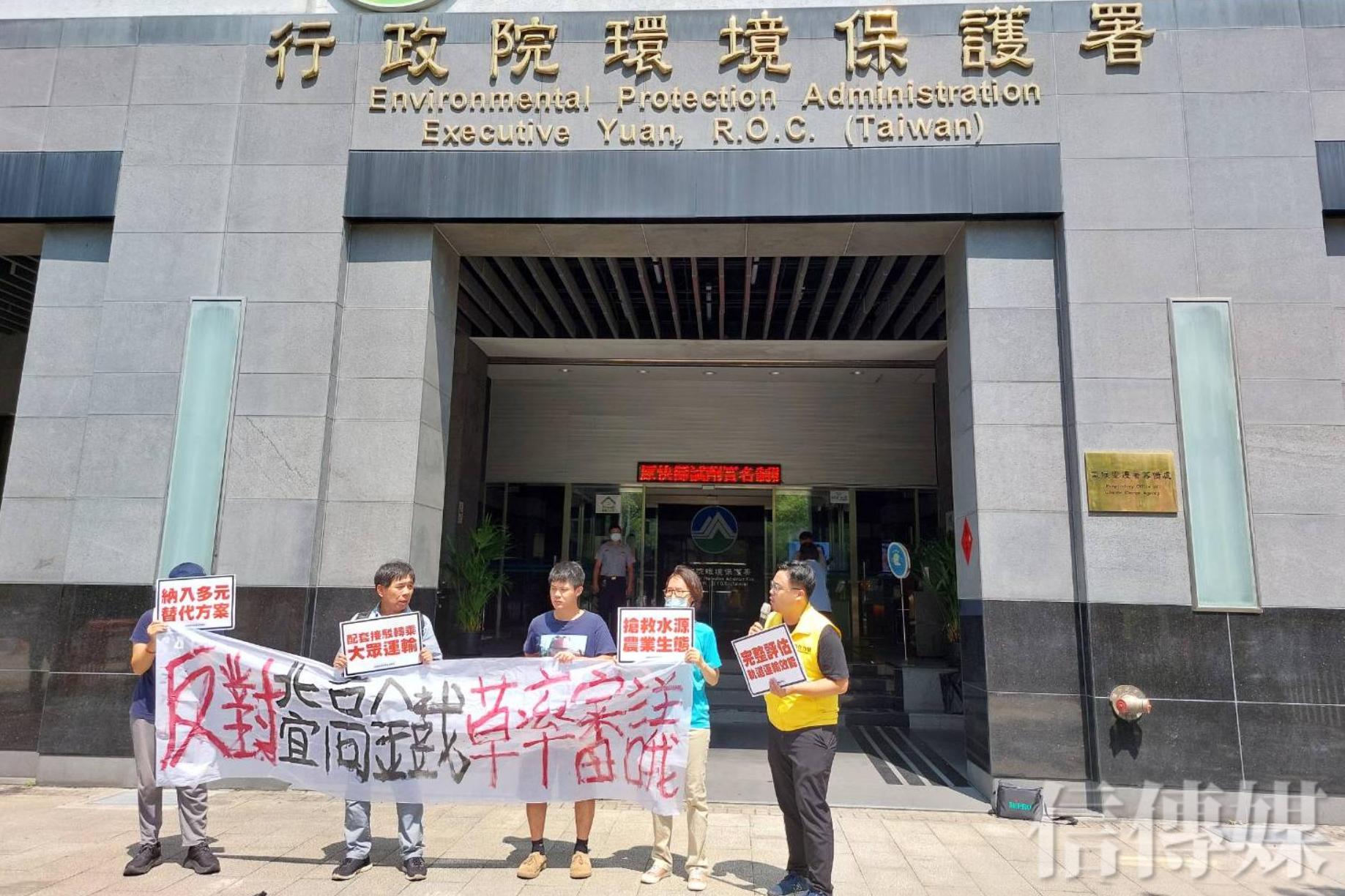 「高鐵延伸宜蘭」計畫(以下簡稱北宜高鐵)第二階段環境影響評估範疇界定今(21)天召開延續會議,高鐵延伸宜蘭監督聯盟在環保署前抗議,時代力量宜蘭黨部執行長郭稟翰與高鐵延伸宜蘭監督聯盟召集人康芳銘帶領宜蘭鄉親在環保署前拉布條,反對高鐵延伸宜蘭草率審議 ,要求環評應納入多元替代方案。