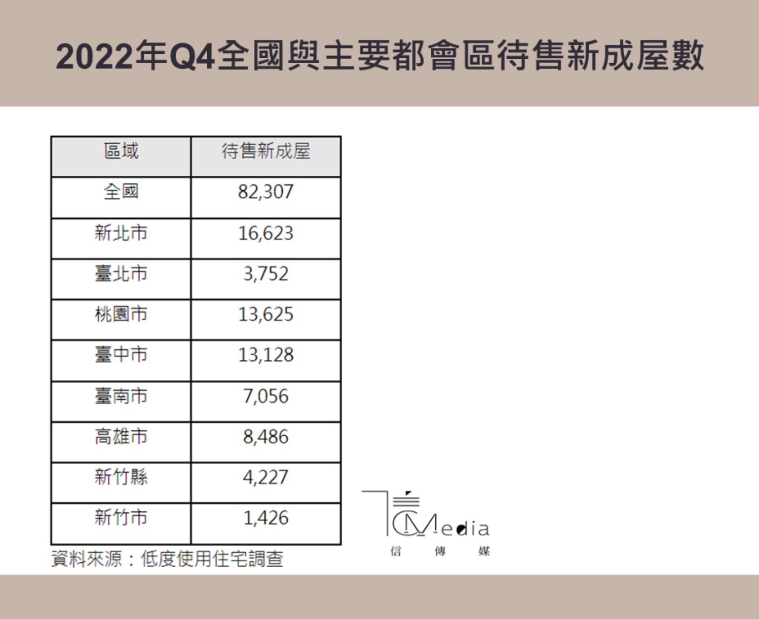 統計顯示,2020下半年到2021下半年,全國待售新成屋維持在7萬戶左右,不過2022年呈現上升趨勢,2022年第四季增加至8.2萬戶,創下統計以來新高,其中有54%都是屋齡2年內的待售新成屋,推估應該與2021使照核發10.5萬戶與2022年11.2萬戶有關,過去預售推案開始進入大量完工期。